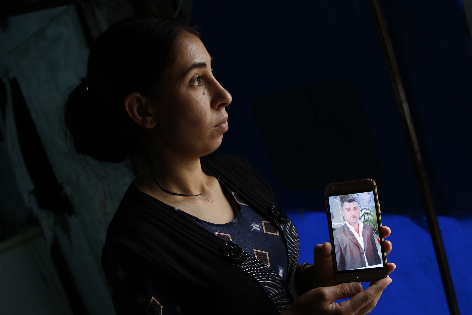 Dans une maison de fortune à proximité du camp de Sharia, Leïla Ale Ali, 30 ans, attend toujours le retour de son mari et de son frère, les yeux rivés sur tout ce qu’il lui reste d’eux : quelques photos sur son téléphone portable.