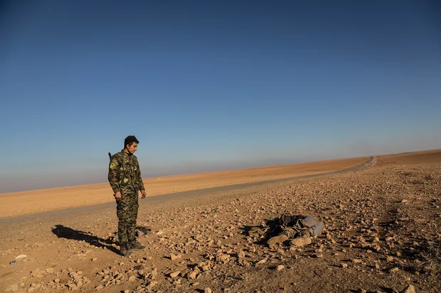 Dans l'hiver syrien, les cadavres des combattants de l’EI sont conservés à température ambiante et exhibés comme des trophées. « Ce porc de Daech [l’EI] était le commandant de son unité. Nous avons d'abord libéré ce village, baptisé Shebher, sur la route de Raqqa », explique à Middle East Eye Ahmed Hussein, jeune combattant arabe exhibant fièrement sa mitrailleuse lourde vers le ciel, ceinture de balles en bandoulière.