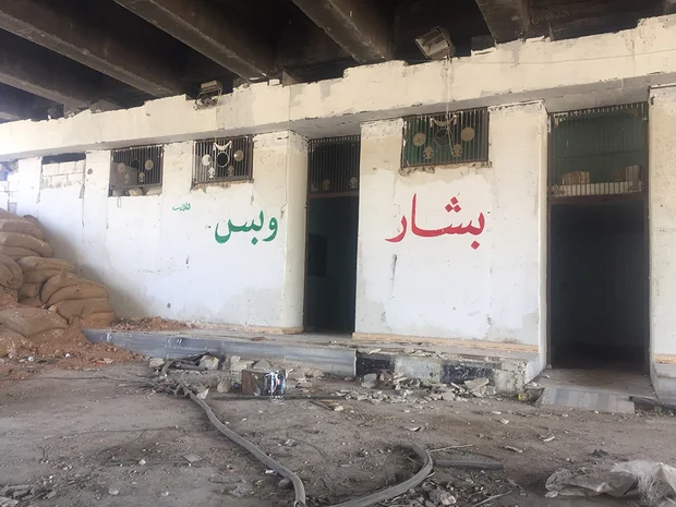 Mon guide du ministère de l’Information s’attarde sur une série de pièces sous un virage en béton sur la route principale que l’EI avait apparemment utilisée comme clinique de fortune pour les combattants blessés. Les graffitis de l’EI ont été repeints et un nouveau slogan a été ajouté : « Bachar et seulement Bachar ».