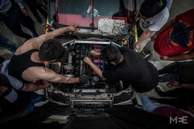 Avant la course, pendant que certains se mettaient en quête d’un endroit paisible derrière le terrain de stationnement pour dérouler leur tapis de prière, d'autres tournaient autour des voitures où pilotes et mécaniciens réglaient les détails techniques de dernière minute. « Les V8 4.4 sont les meilleurs », affirme Youness Rashad, 31 ans, également connu sous le nom de Waleed le « Sniper ». Il continue en expliquant, « d'abord, les pièces de rechange sont disponibles ; deuxièmement, ils ne plient pas sous la pression et, troisièmement, ces moteurs sont très puissants ».