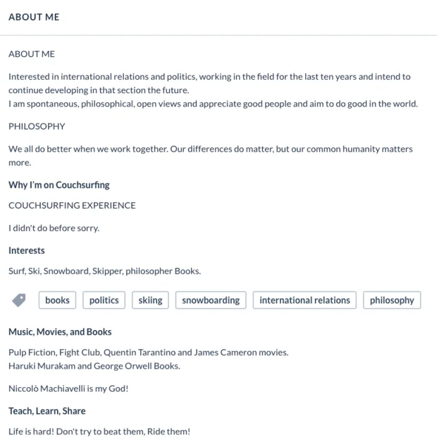 Il est évident que de gros efforts ont été déployés pour limiter les dégâts : une grande partie de sa présence en ligne a été effacée – son profil Twitter n’est plus public et il est impossible de retrouver la moindre de ses pages Facebook – et pourtant on a un aperçu de sa psychologie en consultant son profil de « couch-surfer » (voyageurs se faisant héberger par des hôtes inscrit sur les sites ad hoc), publié en 2013 et qui était lui aussi public, avant son retrait samedi.
