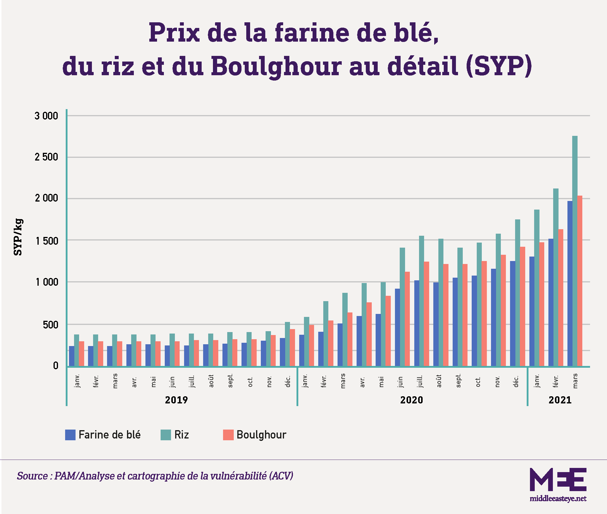 Les prix des denrées alimentaires en Syrie ont été multipliés par près de cinq au cours des dernières années, ce qui oblige les familles à faire des compromis difficiles.