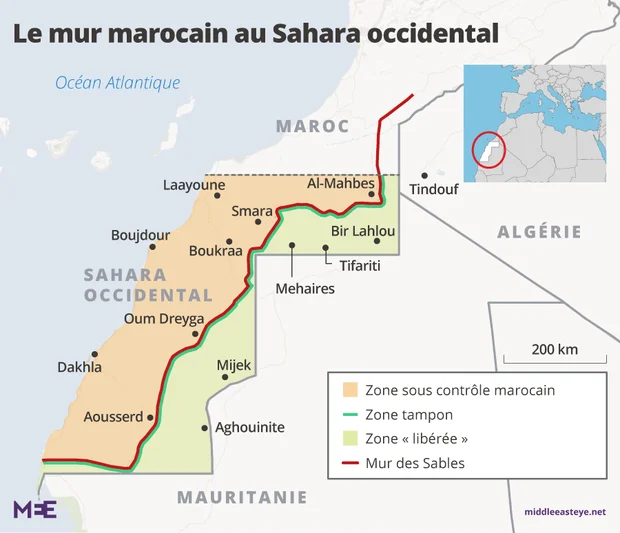 La structure s’étend sur 2 700 km, séparant les régions du Sahara occidental occupées par le Maroc des zones contrôlées par le Front Polisario, soutenu par l’Algérie, qui veut l’indépendance et qui a pris à la Mauritanie le territoire qu’il contrôle lors de la guerre qui a suivi la sortie de l’Espagne de la région.