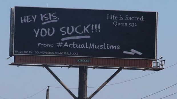 Sound Vision s’est servie d’un panneau d’affichage géant dans une banlieue de Chicago, portant le message « Hey l’EI, t’es nul » et citant le Coran « La vie est sacrée ». Ce message est signé « De la part de vrais musulmans ».