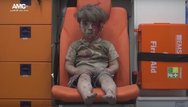 Des milliers de personnes ont partagé l’image d’un garçon ensanglanté et hébété qui a été extirpé d’un bâtiment d’Alep en Syrie suite à un bombardement sur la ville assiégée.