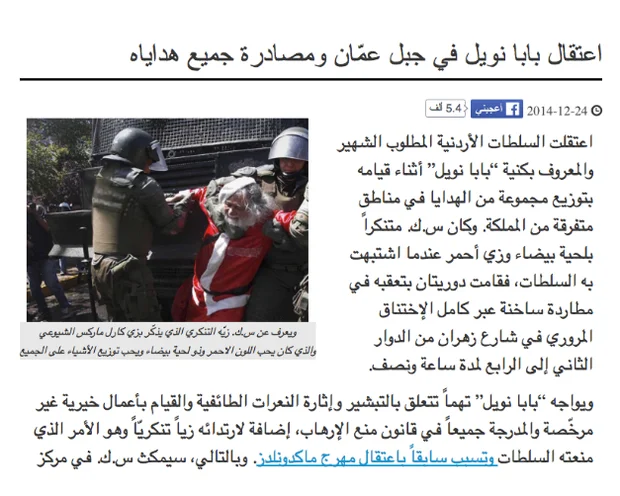L’article le plus populaire d’al-Hudood expliquait que le Père Noël s’était vu confisquer ses cadeaux pour ne pas avoir payé les droits de douane. L’article a fait le buzz et a été pris au sérieux par suffisamment de personnes pour que la Direction de la sécurité publique jordanienne publie un démenti (avec l’aimable autorisation d’al-Hudood)