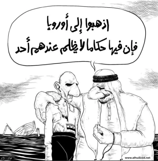 Une caricature originale d’al-Hudood montre un homme du Golfe disant à un réfugié syrien « Va en Europe, tu y trouveras des dirigeants qui ne t’opprimeront pas » (avec l’aimable autorisation d’alhudood.net)