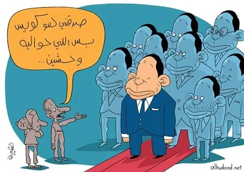 Une caricature d’al-Hudood montre un homme désignant le président égyptien Abdel Fattah al-Sissi : « Croyez-moi, c’est un homme bon. Ce sont les personnes autour de lui qui sont mauvaises ». La caricature tourne en dérision l’habitude des Arabes consistant à refuser d’admettre que leurs dirigeants sont corrompus (avec l’aimable autorisation d’alhudood.net)