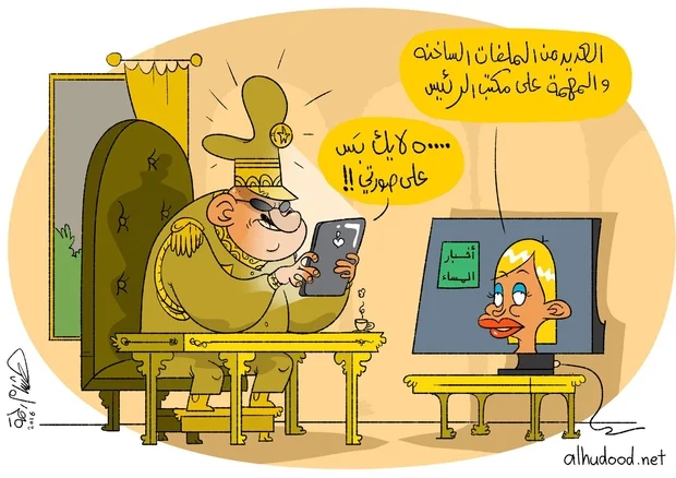 Une caricature originale d’al-Hudood montre une présentatrice de journal télévisé rapportant qu’il y a « beaucoup de dossiers chauds sur le bureau du dirigeant », tandis qu’un dirigeant d’un pays du Moyen-Orient, indifférent, regarde son iPad et hurle « Seulement 5 000 "J’aime" sur ma photo ! » (avec l’aimable autorisation d’alhudood.net)