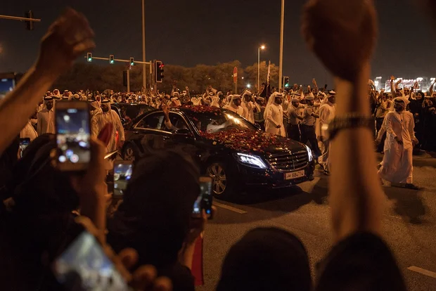 En fin de soirée, Tamim ben Hamad al-Thani fait son apparition. Sa voiture couverte de pétales de fleurs s'arrête une fois. Il salue la foule, entouré de gardes du corps. Puis il reprend la route au pas. Des hommes chantent ses louanges, on agite des drapeaux, tandis que les plus jeunes courent le long des barrières pour immortaliser une dernière fois son visage.