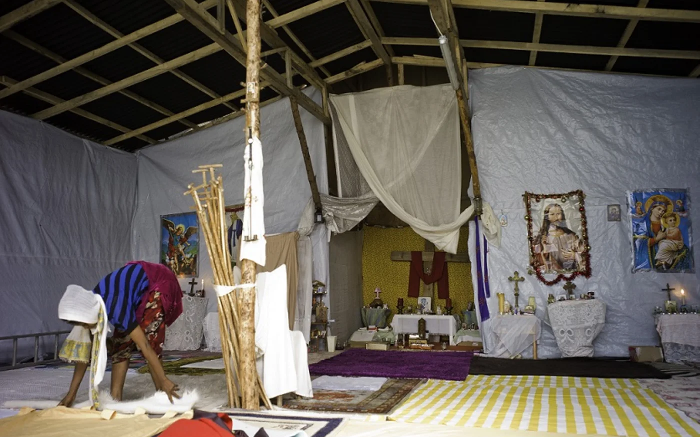 Mais les habitants ont aussi pensé au salut des âmes et des esprits. Dans le quartier éthiopien s’élève une église orthodoxe de 15 m de haut. La construction est faite de planches solides qui respectent l’architecture religieuse : nef, chœur et autel. Des femmes s’affairent, balaient à l’aide d’un chiffon pour l’office du dimanche qui rassemble jusqu’à 200 personnes. Ici, pas de chaises mais des tapis que les femmes disposent soigneusement dans ce lieu où on se déchausse avant d’entrer. Les crucifix, les cierges, fleurs et icônes de papier figurant le Christ rappellent que le lieu est orthodoxe. Une dame anglaise offrira d’ailleurs, soigneusement protégée dans un papier de soi, une icône qu’elle montre avec joie.