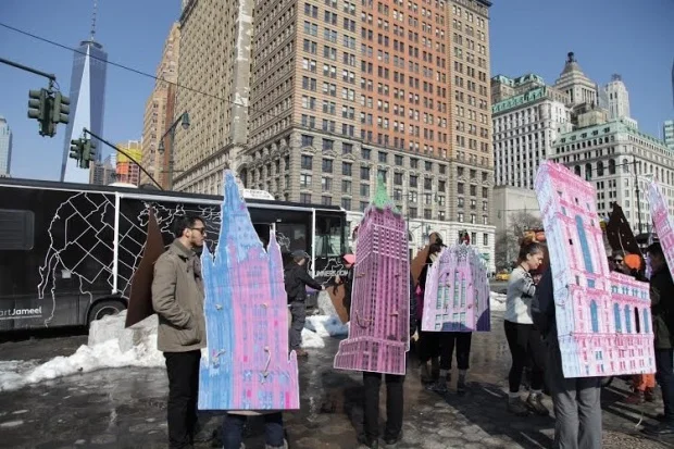 Le projet de Zegeer a atteint son apogée en mars lors d’un spectacle historique dans les vestiges de Little Syria. Une fois le camping-car garé, les militants ont parcouru la zone, malgré la neige et la boue, en portant des bannières colorées représentant les bâtiments du quartier au temps de son âge d’or arabe.