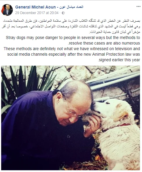 Le président libanais Michel Aoun a partagé une photo de lui-même avec son propre chien et a rappelé une nouvelle loi adoptée en août 2017 qui pourrait voir toute personne coupable de nuire à des animaux écoper d’une amende pouvant aller jusqu’à 13 000 dollars.