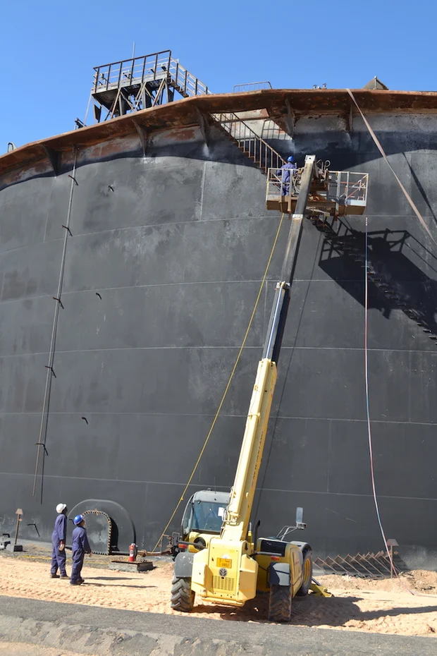 Les employés de Wafa Oil, en charge du site, s’activaient autour des citernes incendiées. Pendant qu’un groupe changeait une valve obstruée par du pétrole consolidé par des mois d’inactivité, un homme repeignait en blanc une citerne. Sur une autre, les ouvriers retiraient l’escalier de fer qui menaçait de s’écrouler.