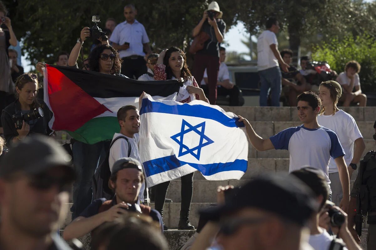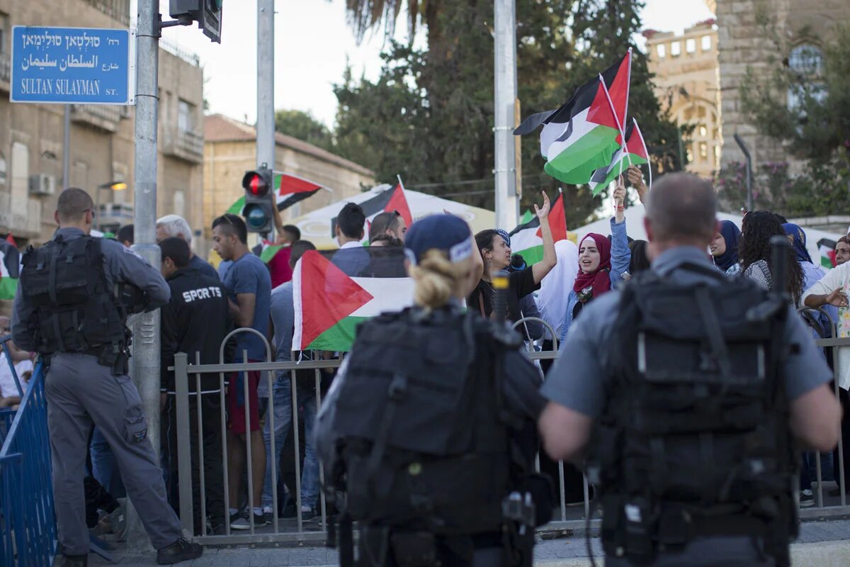 Palestinian protesters hold a Palestinian flag as Israeli youth hold an Israeli flag outside Jerusalem's Old City (MEE/Oren Ziv)