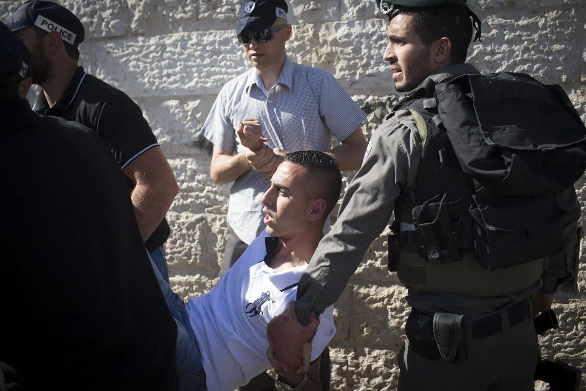 Israeli police arrest a Palestinian protester outside Jerusalem's Old City (MEE/Oren Ziv)