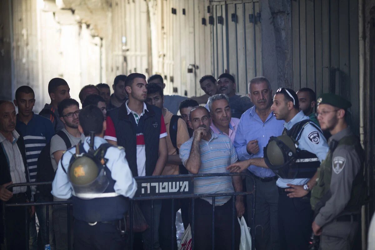 Israeli police officers prevent Palestinians to pass in al-Wad street in Jerusalem's Old City (MEE/Oren Ziv)
