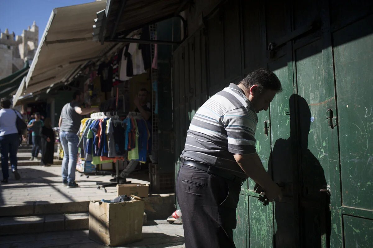 A Palestinian shop owner closes his shop before the flag march in Jerusalem's Old City (MEE/Oren Ziv)