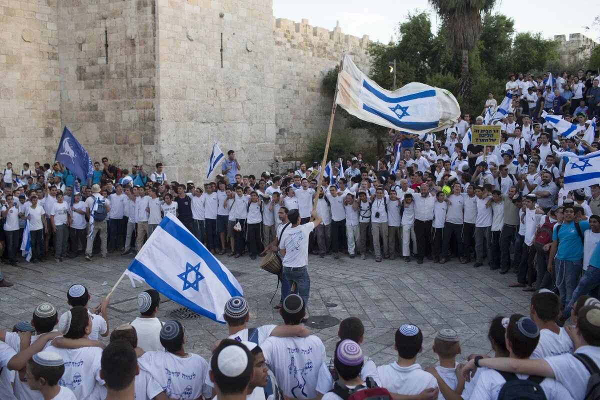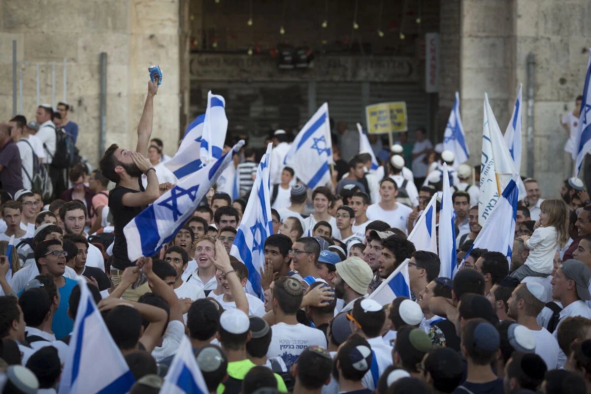 Israeli youth sing and dance as they enter Jerusalem's Old City during the flag march (MEE/Oren Ziv)