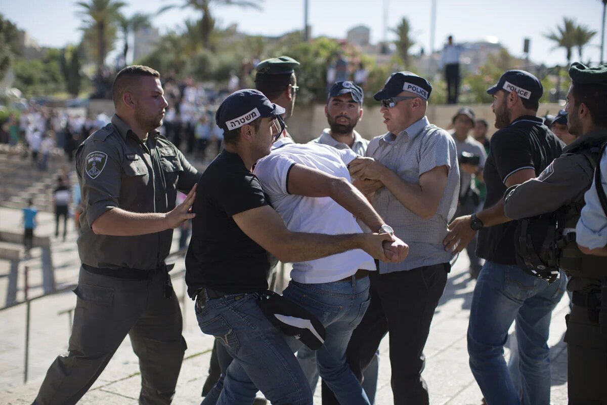 Plain-clothed police officers arrest a Palestinian protester outside Jerusalem's Old City as the flag march takes place (MEE/Faiz Abu Rmeleh)