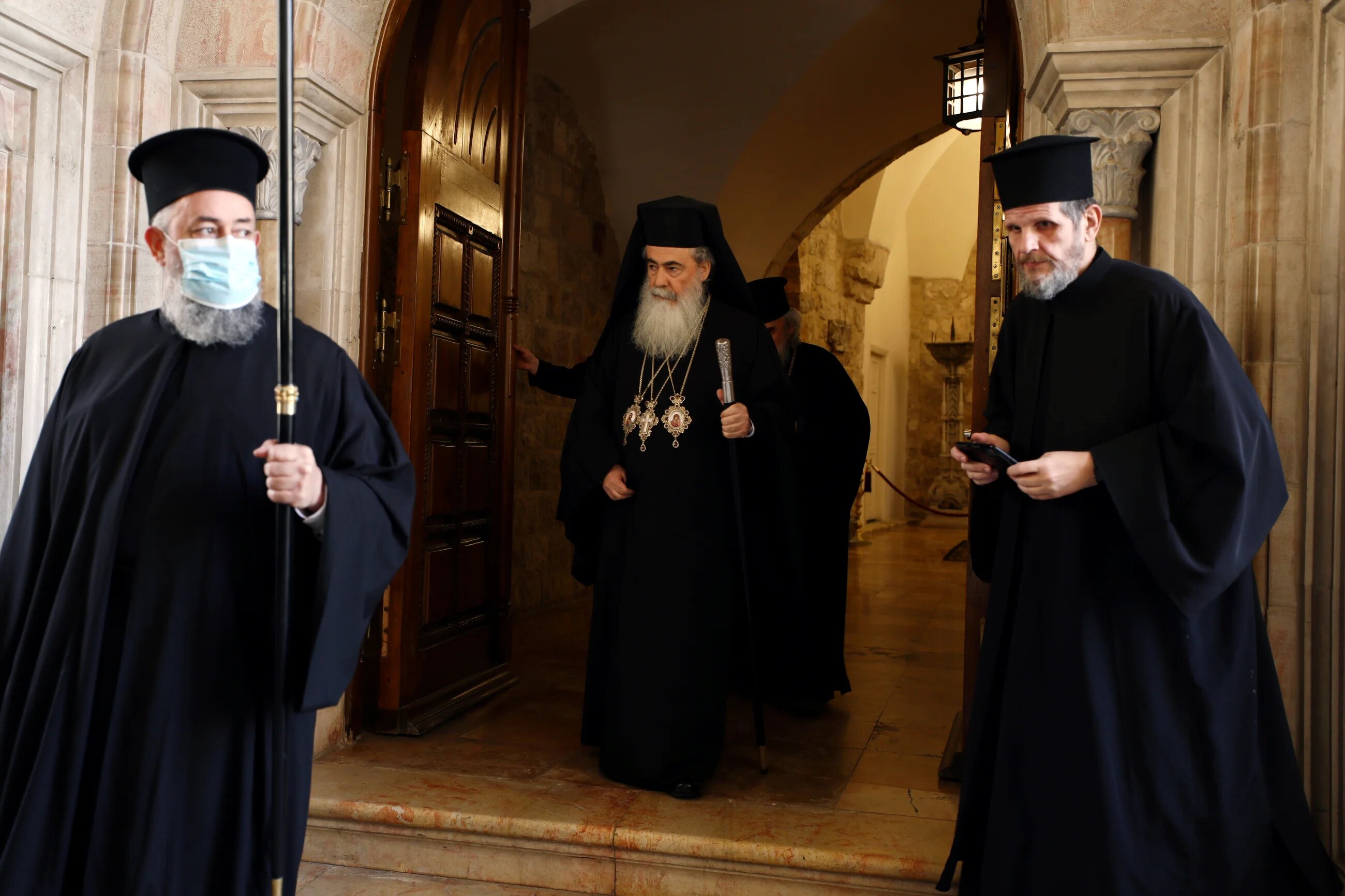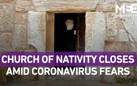 There were few people on the streets as the procession of clergymen went past the Church of the Nativity in Bethlehem in the occupied West Bank, by tradition the birthplace of Jesus. (Mussa Qawasma/Reuters)