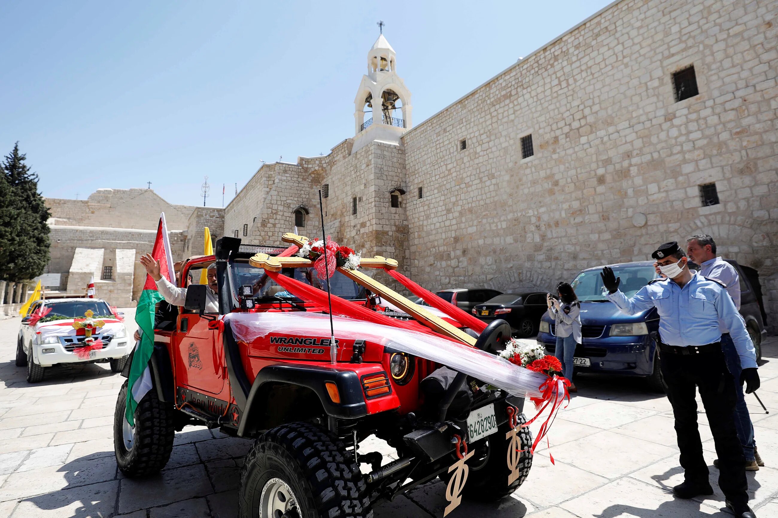 A man in a decorated vehicle gestures before the arrival of the Holy Fire outside the Church of the Nativity in Bethlehem, which is closed amid concerns about the spread of the coronavirus disease. (Mussa Qawasma/Reuters)