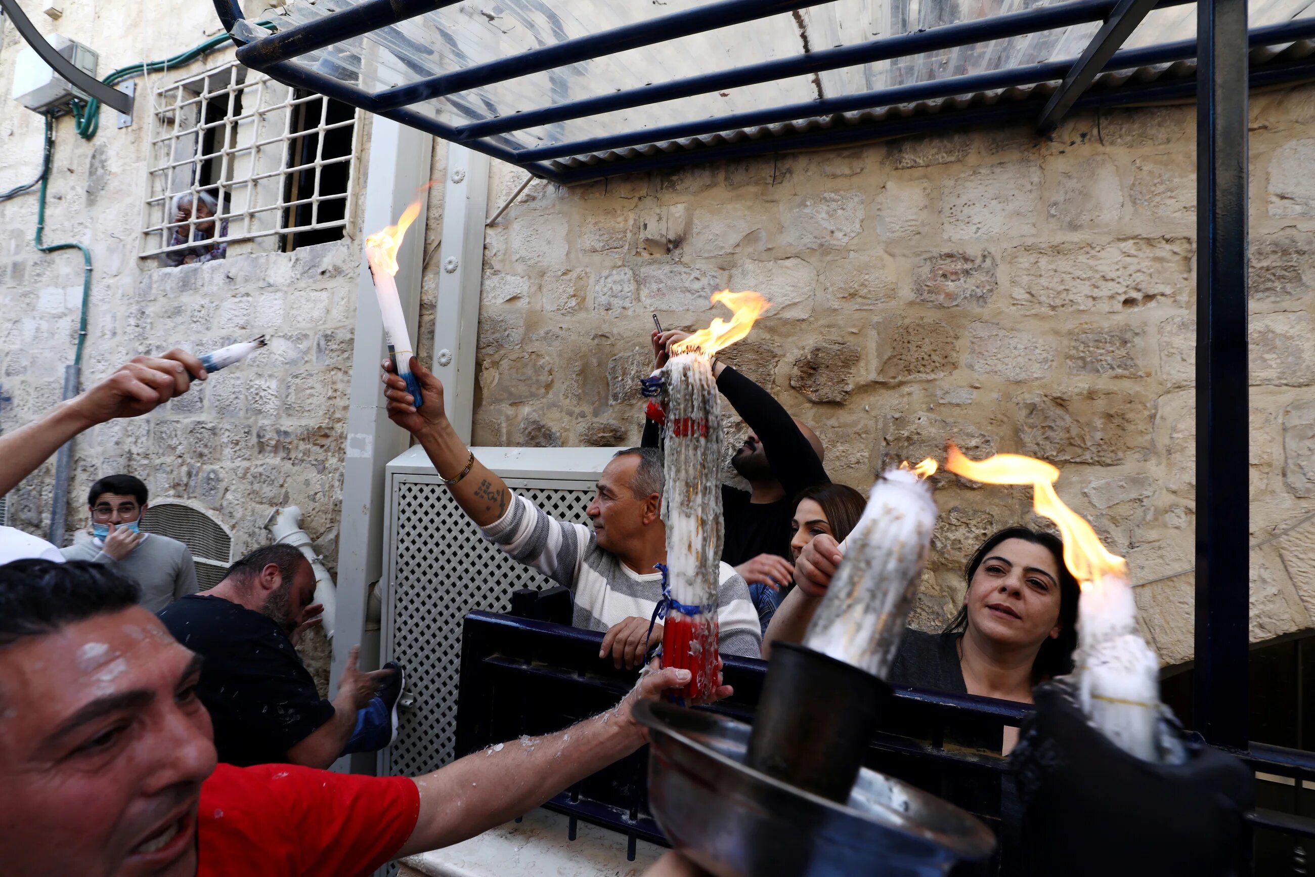 Orthodox Christian worshippers held blazing candlesticks and distributed them to residents around Jerusalem's Old City after the Holy Fire ceremony took place in the Church of the Holy Sepulchre. (Reuters/ Ammar Awad)