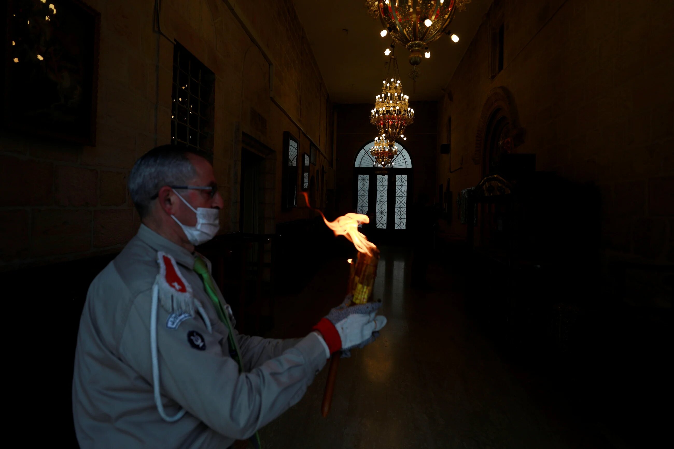 A Palestinian scout holds candles lit from the Holy Fire during a ceremony celebrated amid restrictions due to the coronavirus disease in a church in Ramallah in the Israeli-occupied West Bank. (Reuters/Mohamad Torokman)