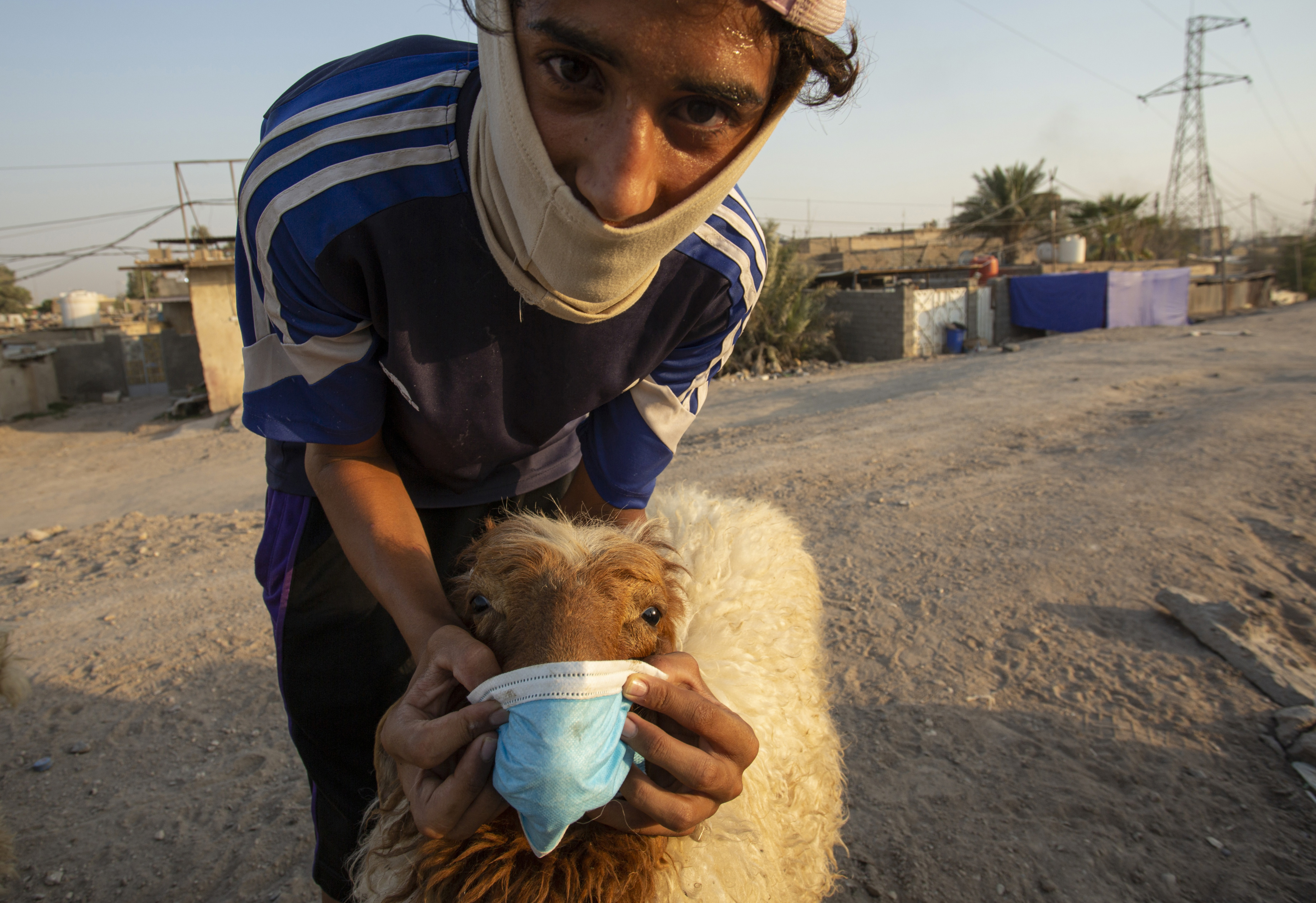 An Egyptian boy wears a protective mask inside a slaughterhouse during celebrations marking the Muslim holiday of Eid al-Adha amid the coronavirus pandemic in Cairo (Reuters/Amr Abdallah Dalsh)