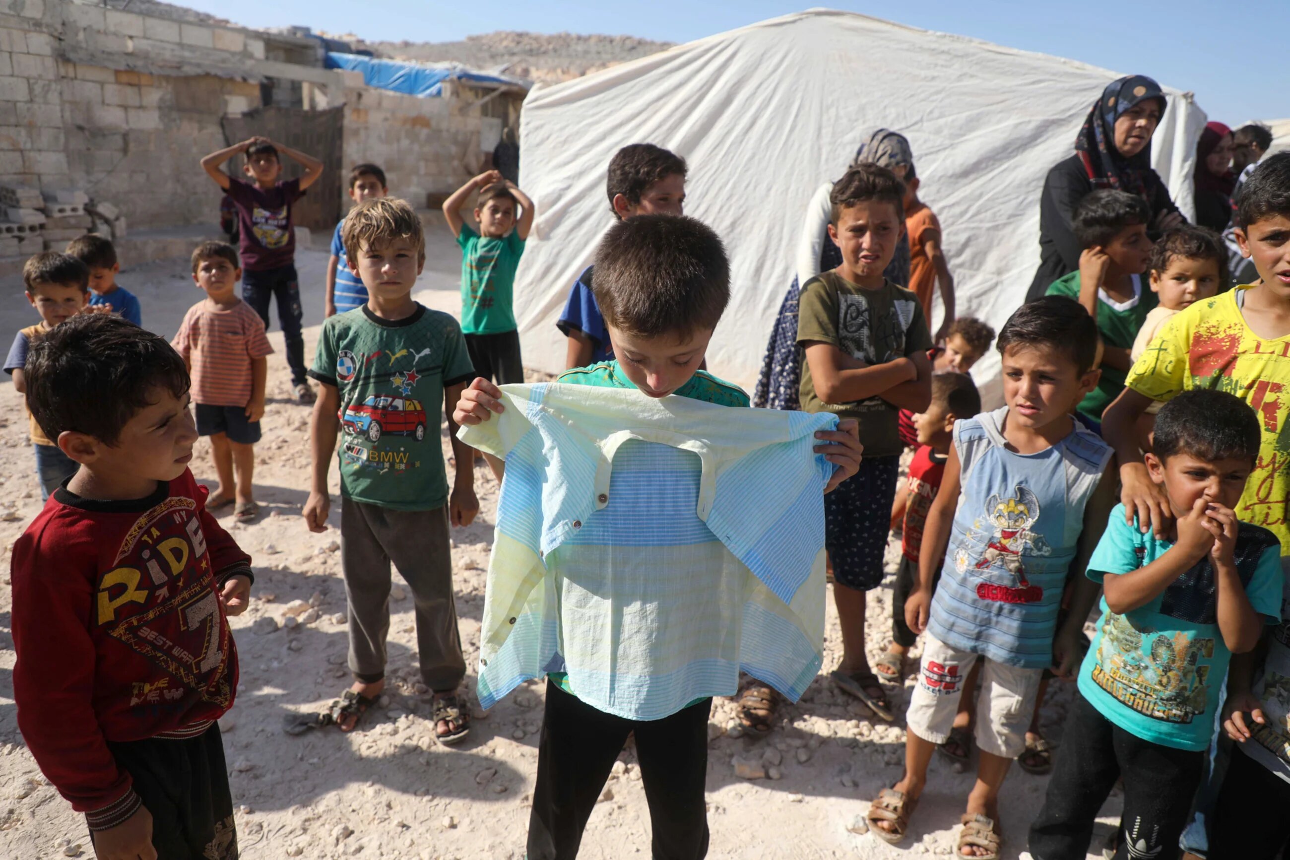 A displaced Syrian boy poses with his new shirt, provided by an NGO as an Eid al-Adha gift, at a camp for the internally displaced near the town of Sarmada in Syria's northwestern Idlib province (AFP/Aaref Watad)