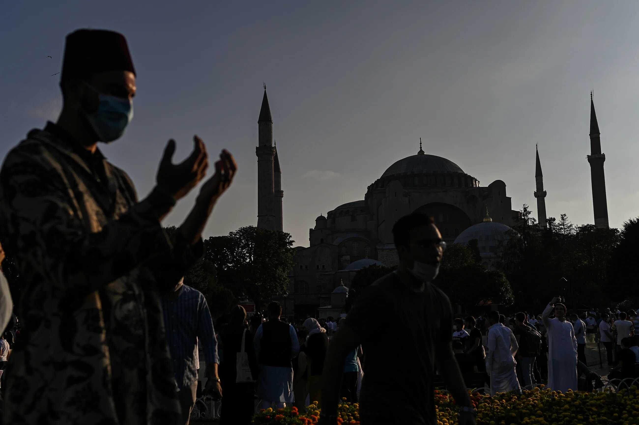 A man wearing a fez prays during the Eid al-Adha prayers outside the Hagia Sophia in Istanbul. The ancient building was reconverted to a mosque after eight decades this month by President Recep Tayyip Erdogan (AFP/Ozan Kose)