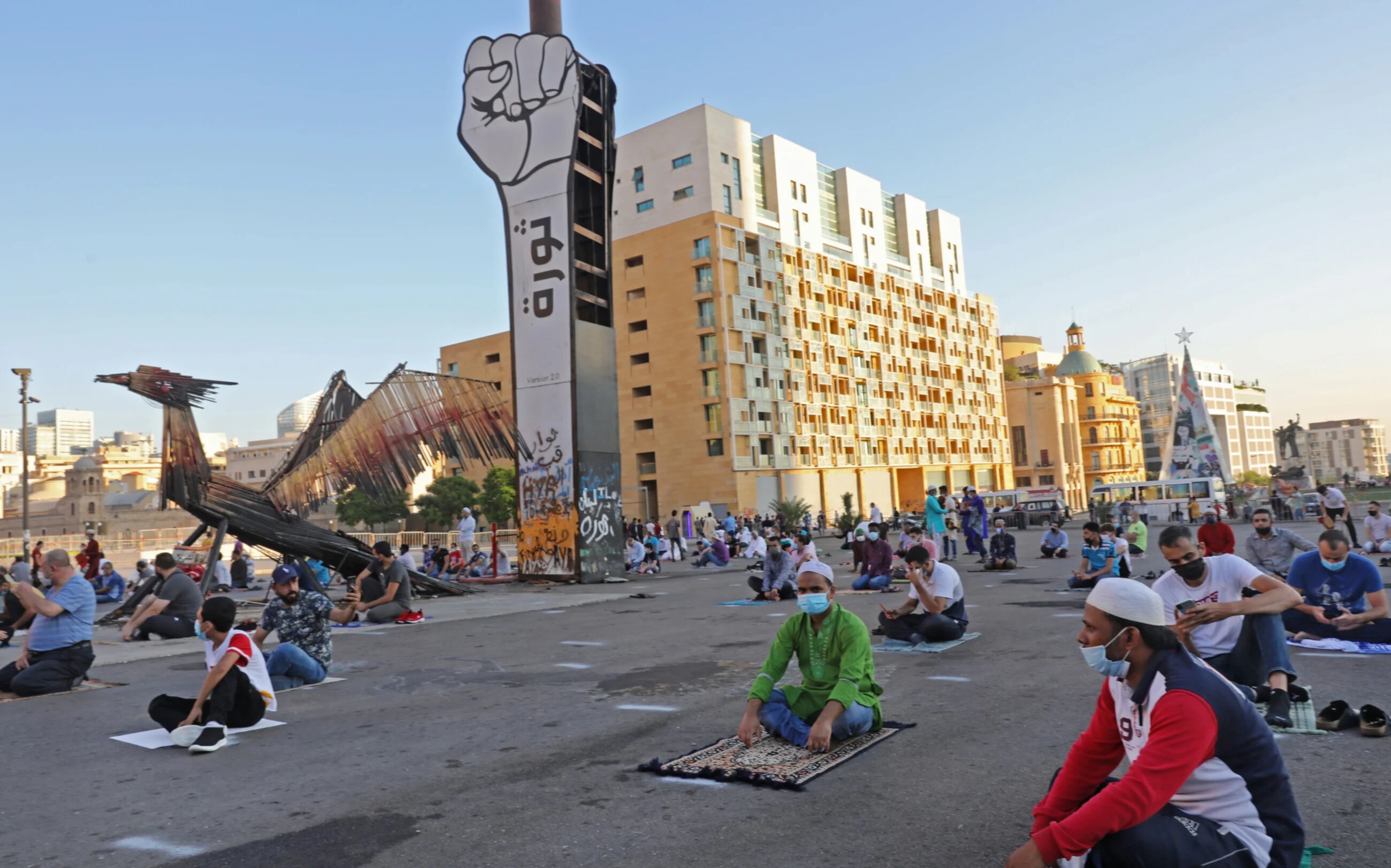 Muslim worshippers, observing social distancing in accordance with coronavirus restrictions, pray on the first day of Eid al-Adha outside the Mohammad al-Amin Mosque in Beirut. A symbolic raised fist erected by protesters during the months-long uprising against the political elite can be seen in the background (AFP/Anwar Amro)