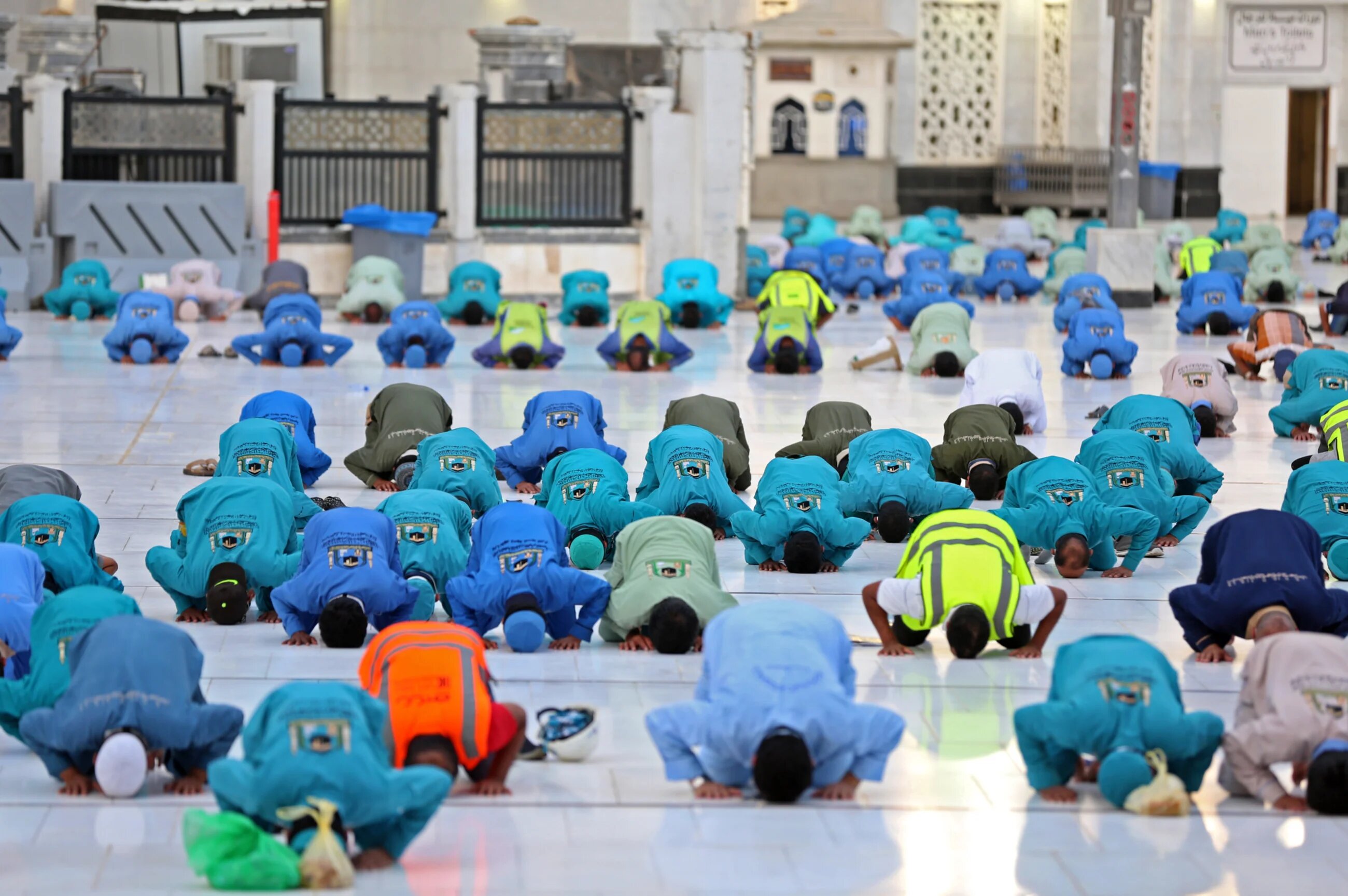 Workers performing Eid al-Adha prayer at the grand mosque in Saudi Arabia's holy city of Mecca. Muslim pilgrims converged today on Saudi Arabia's Mount Arafat for the climax of this year's Hajj, the smallest in modern times and a sharp contrast to the massive crowds of previous years (AFP)