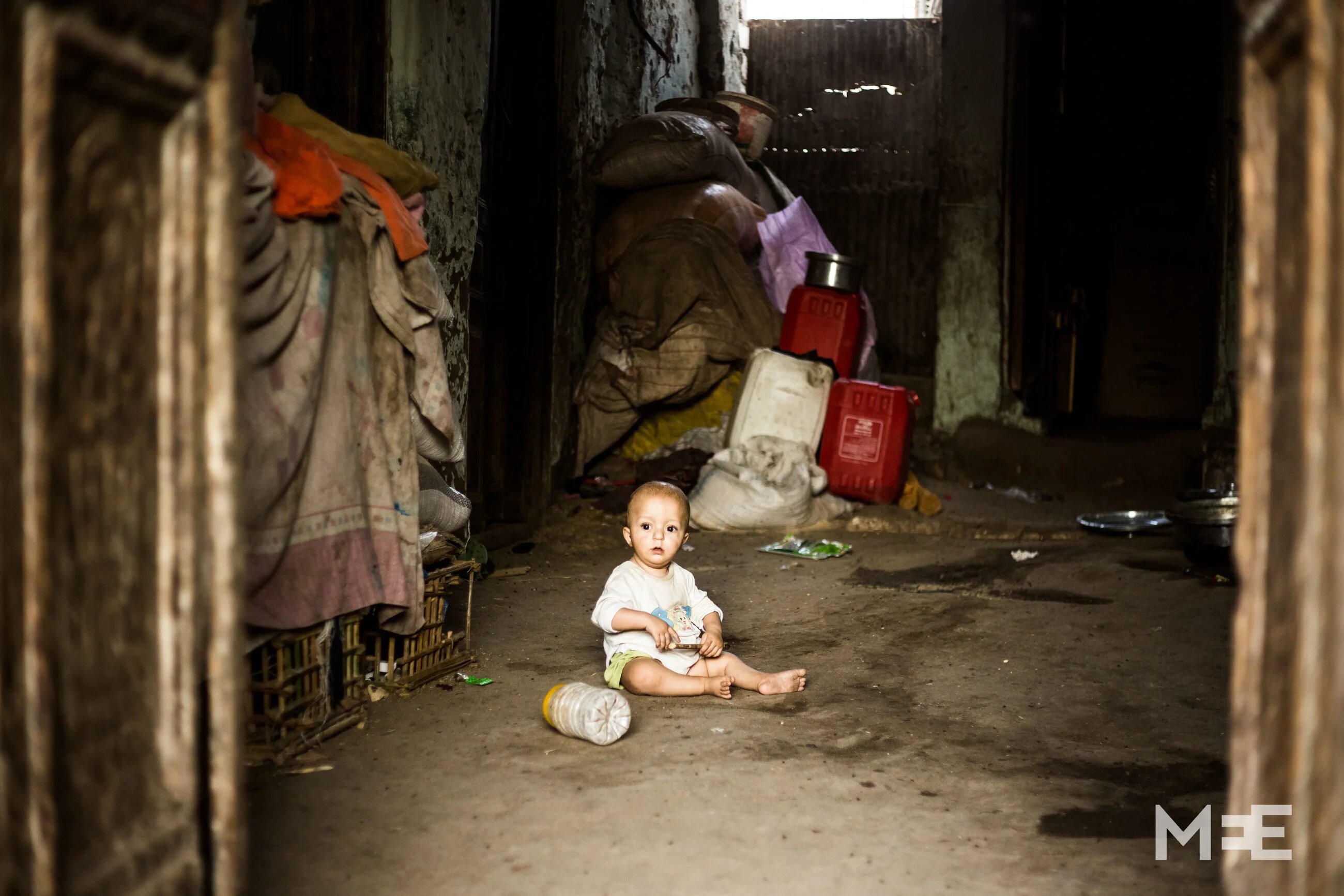A baby sits in a quiet corner of Fadl Island, a refugee camp that evolved with time into a small village now inhabited by a third generation of 1948 Palestinian refugees (MEE/Ibrahim Ahmad)