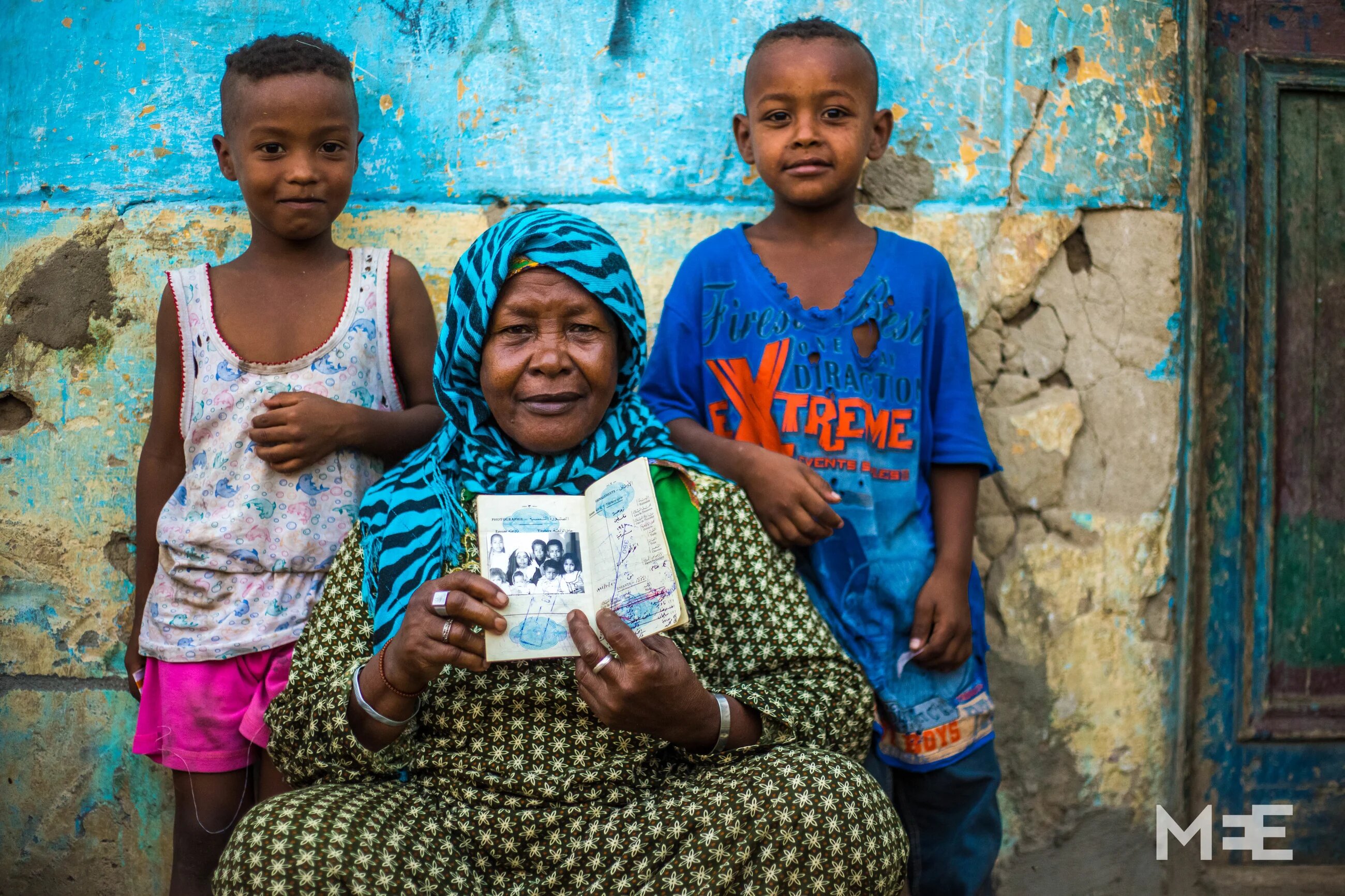 Amira, over 80 years old, is one of the few remaining Palestinian refugees who fled to Egypt escaping the war in 1948. Here she shows her refugee passport which has a picture of her and her children in it. Now she sits with two of her grandchildren beside her (MEE/Ibrahim Ahmad)