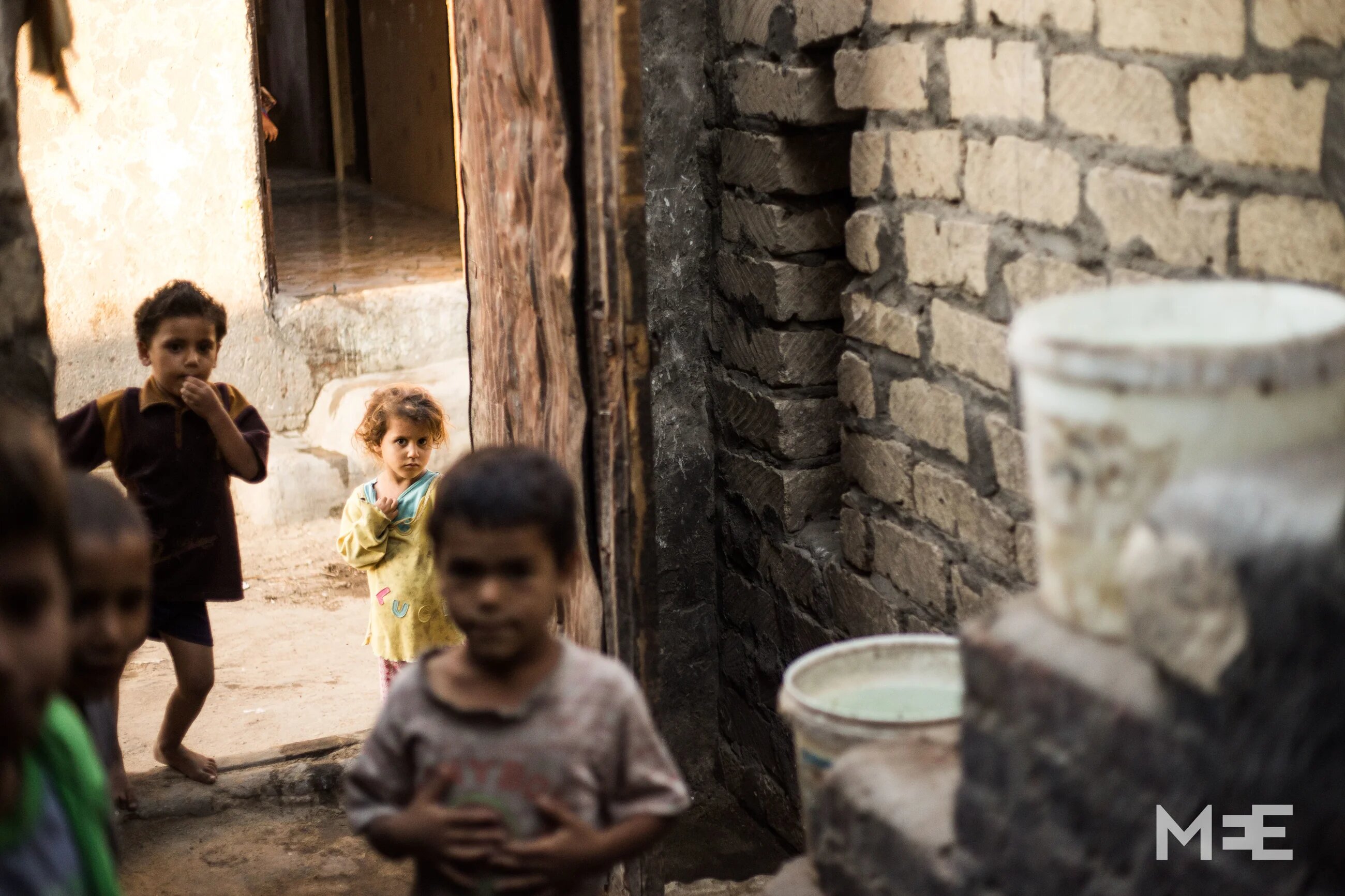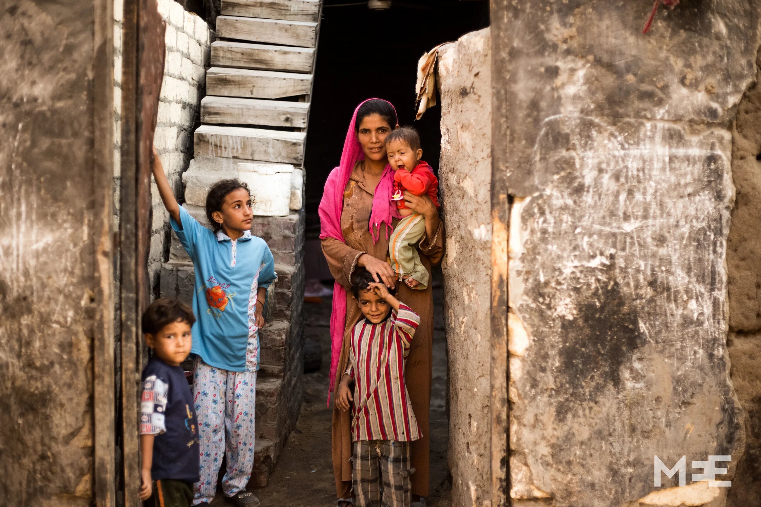 Sohair El Said, a 35-year-old housewife, stands in front of her simple home surrounded by her children (MEE/Ibrahim Ahmad)