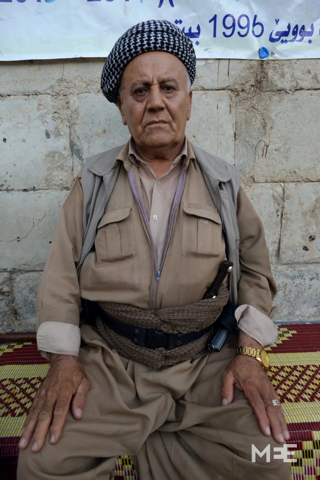 An old Peshmerga fighter in the tea shop behind a bazaar in Akre. Like all former guerrillas, he still wears traditional clothes and always carries a mall knife and a handgun with him (MEE/Jerzy Wierzbicki)