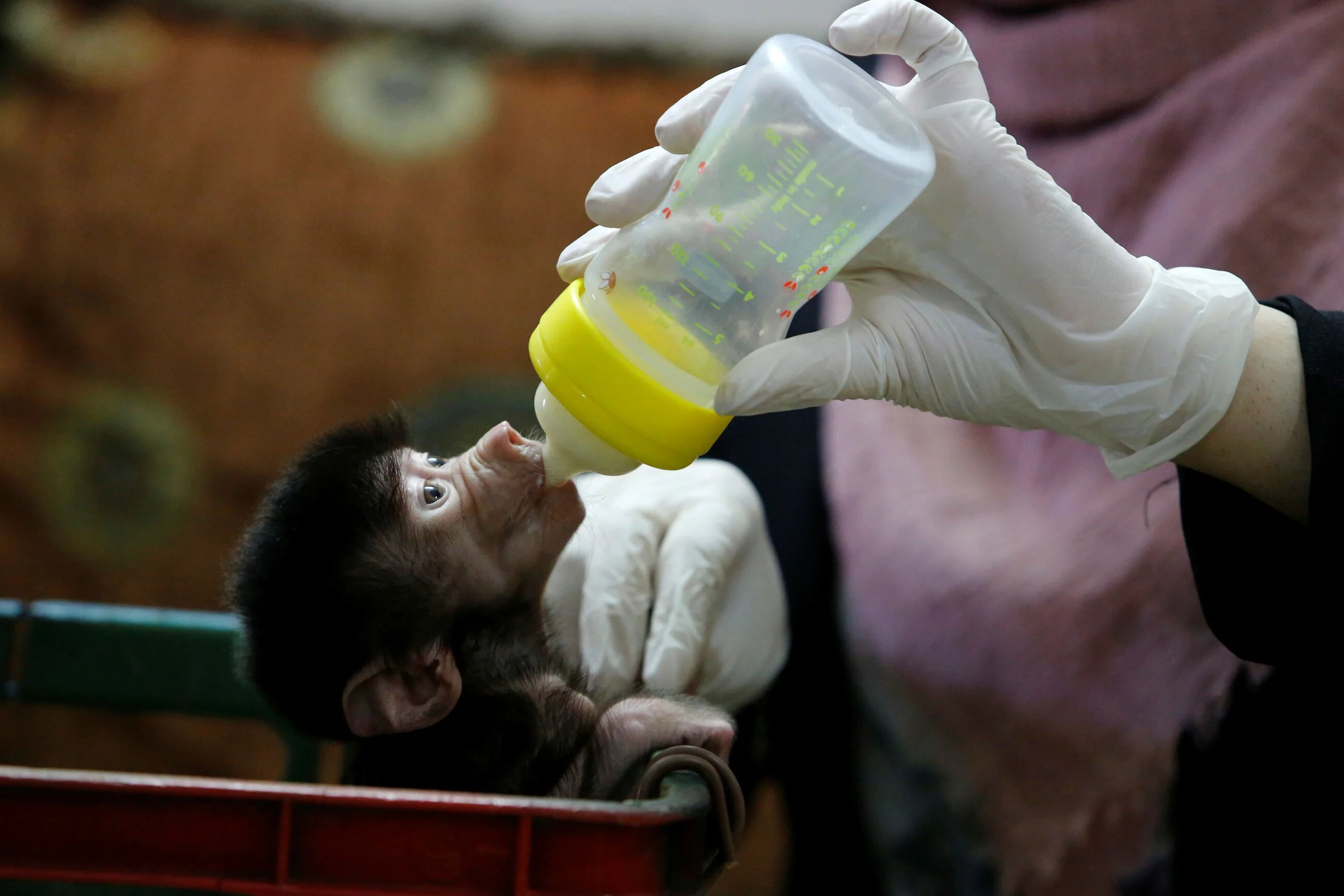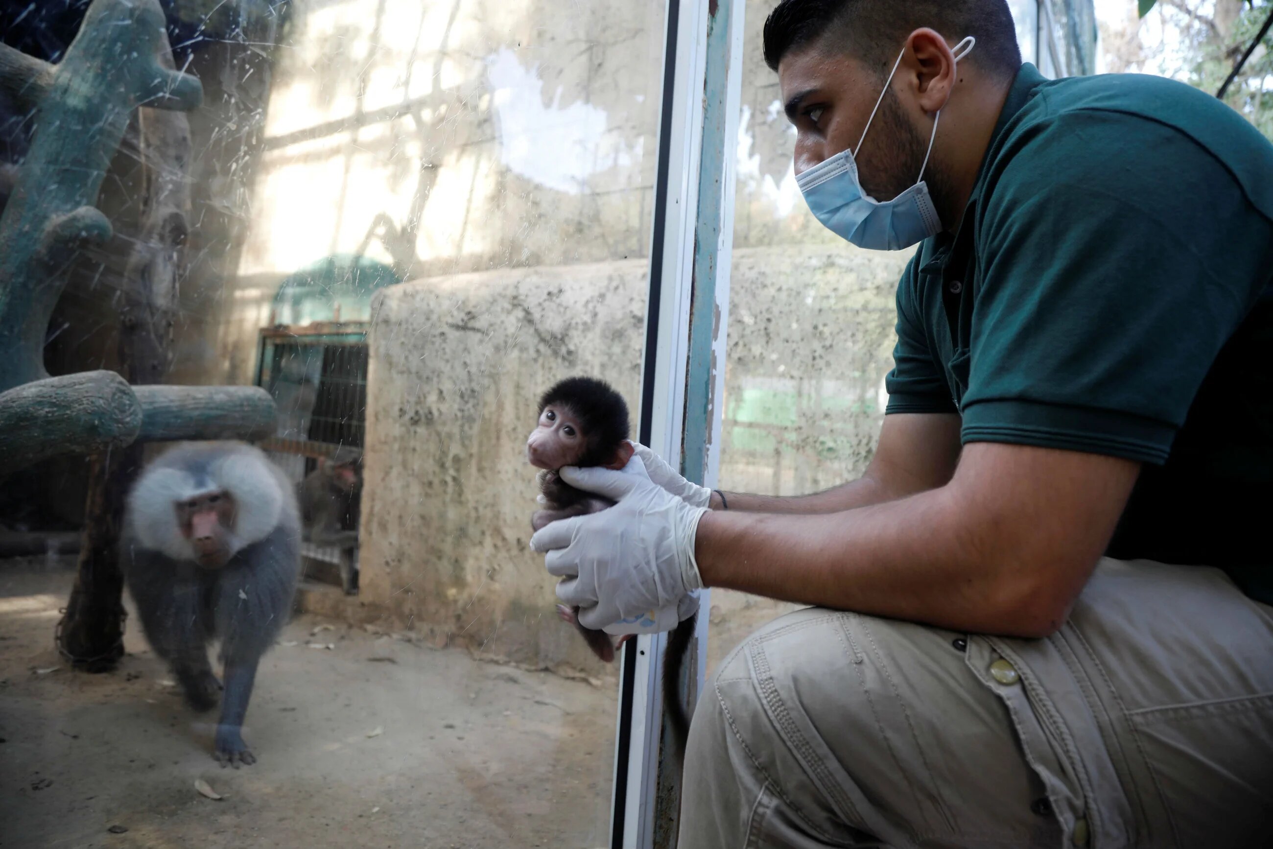 In the monkey enclosure, usually bedevilled by miscarriages, one baboon gave birth, although she had little inclination to take care of the baby. "My father had to bring him to our house," said Khader's daughter, Hind. "I took care of him and gave him milk" (Reuters/Raneen Sawafta)