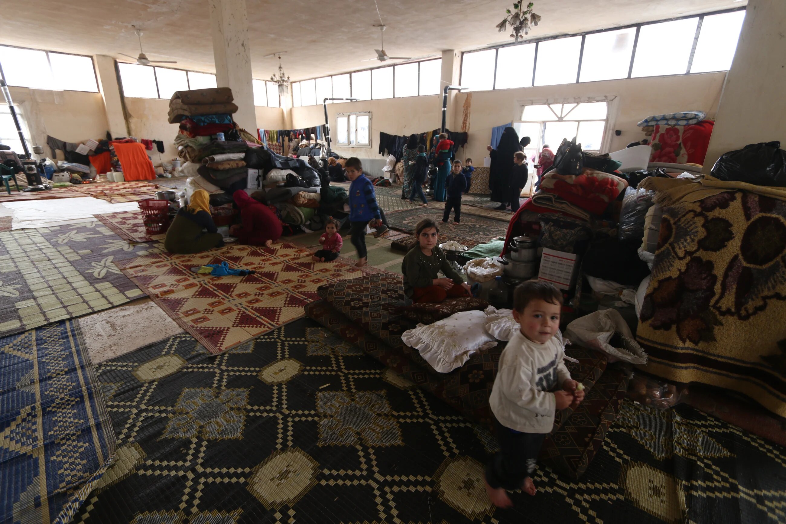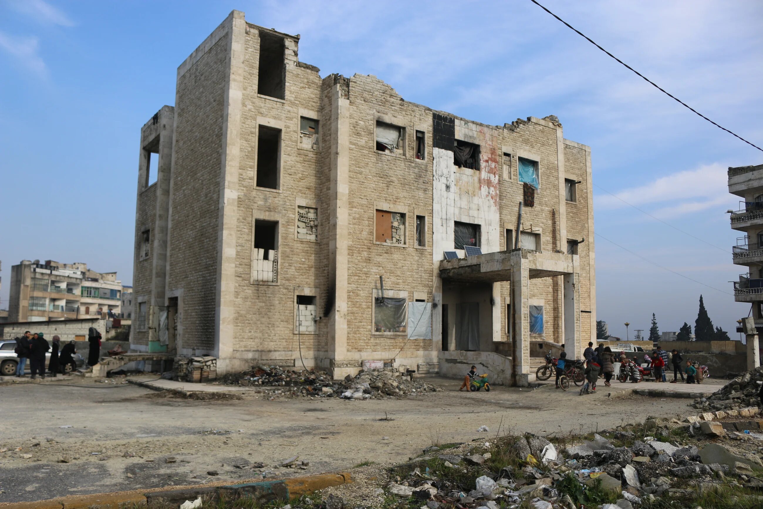 The hollowed-out remains of a police station in the city of Maarat al-Numan houses dozens of families (MEE/Mustafa Dahnon)