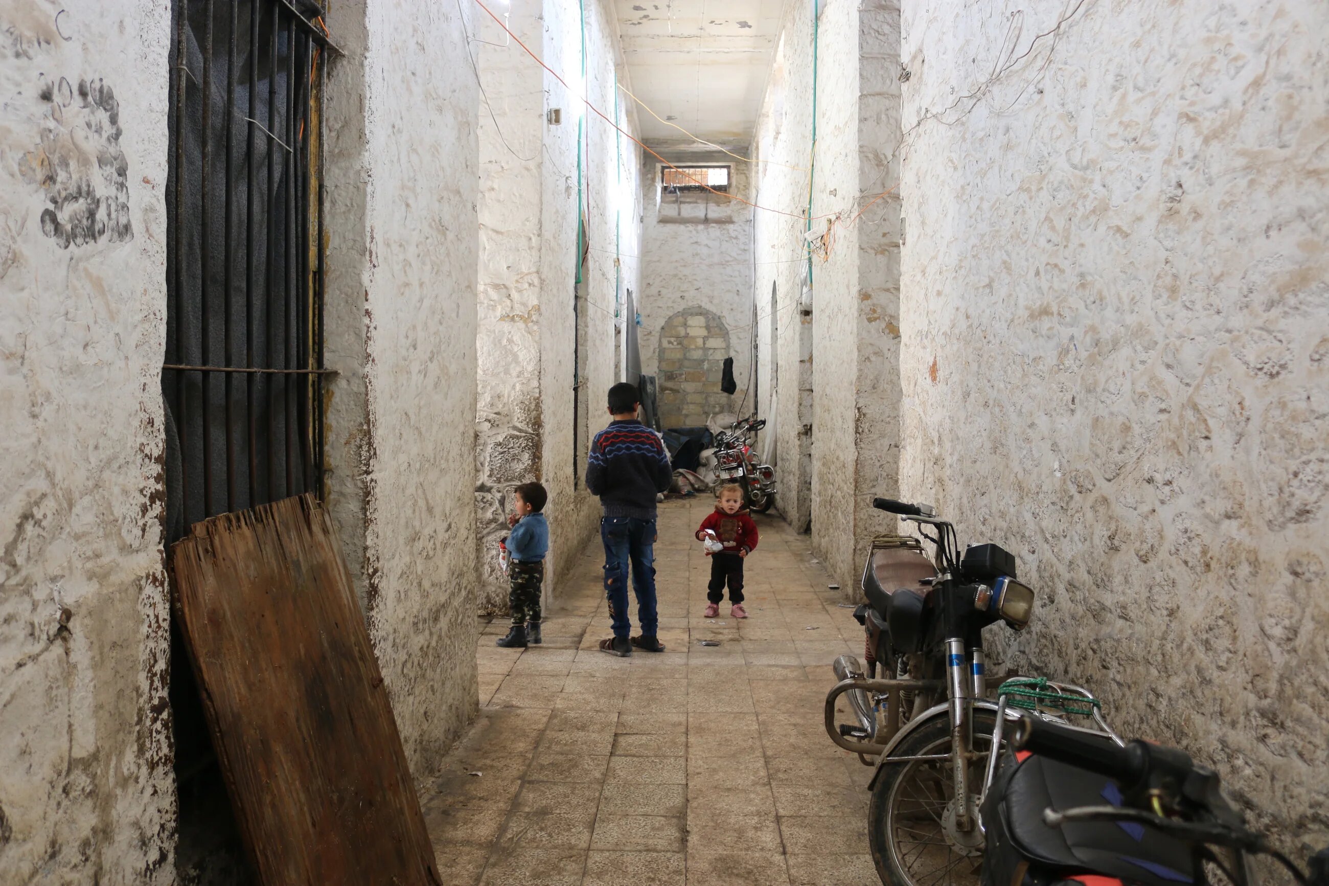 The steep walls of an old prison house those displaced from the southern countryside of Idlib (MEE/Mustafa Dahnon)