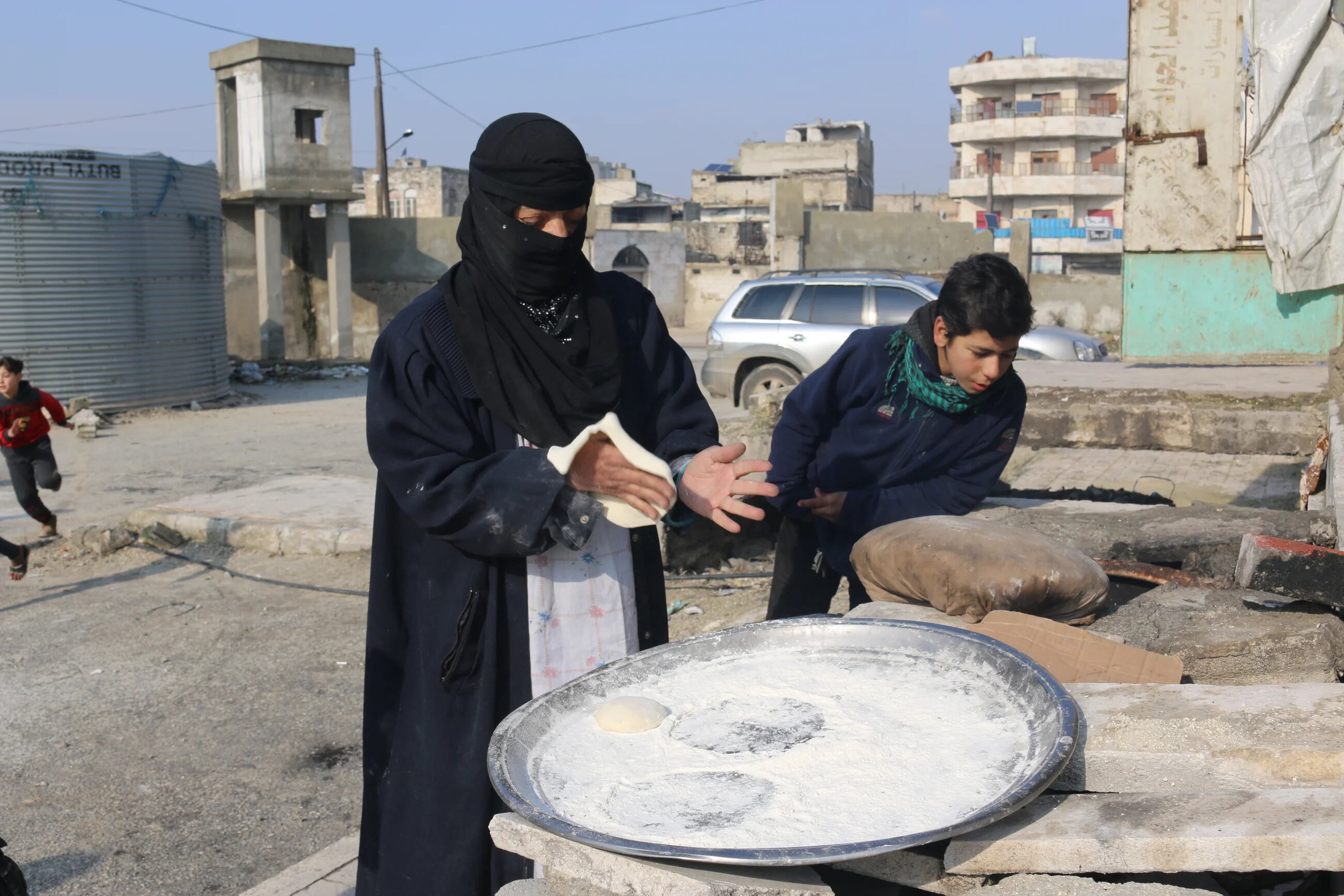 An elderly woman, who has been recently displaced for the second time and now lives in the old police station in Maarat al-Numan, can be seen making bread (MEE/Mustafa Dahnon)