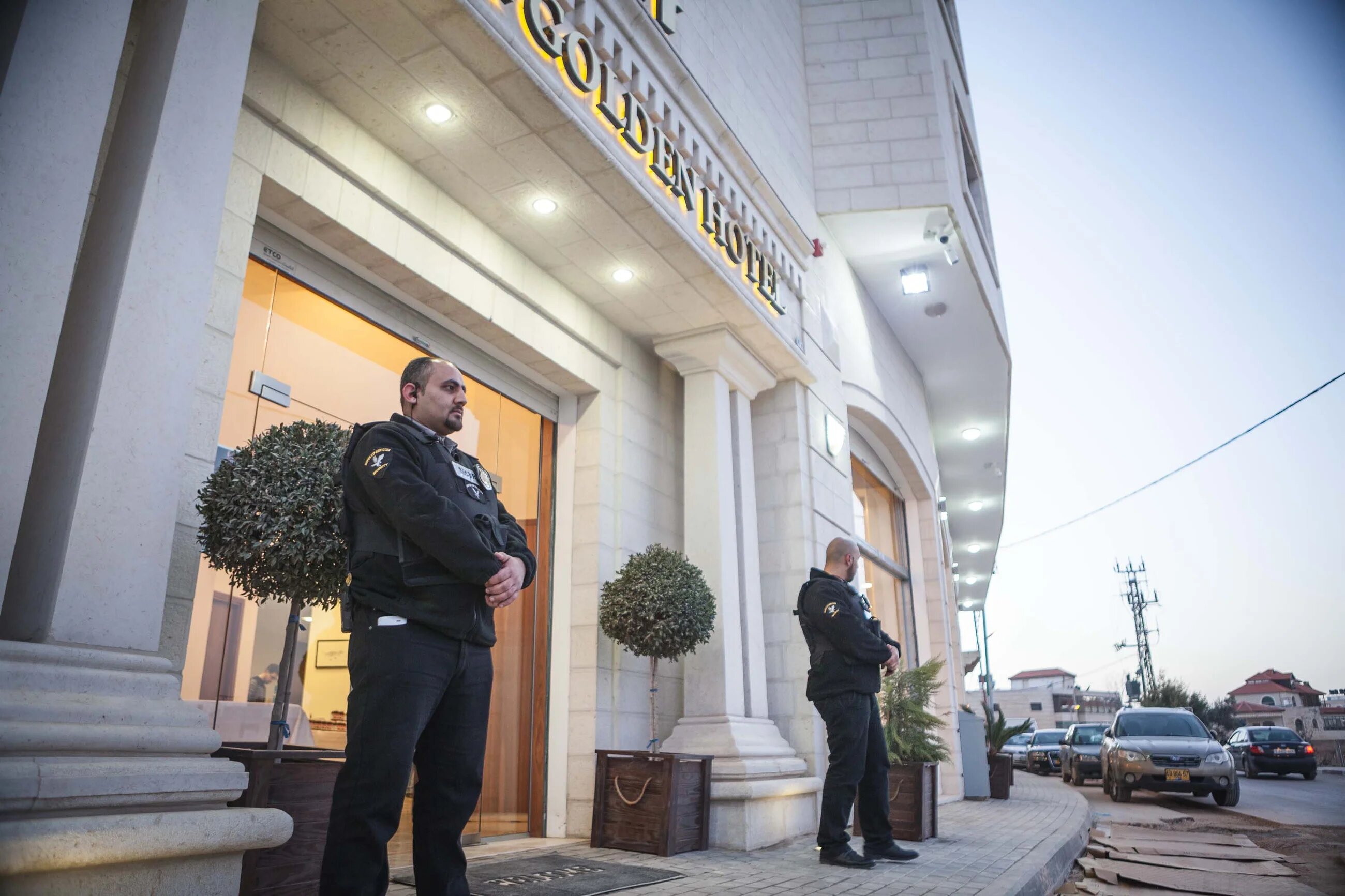 Security guards outside the main entrance to the Taybeh Golden Hotel where the event was held. (MEE/Andrea Dicenzo)