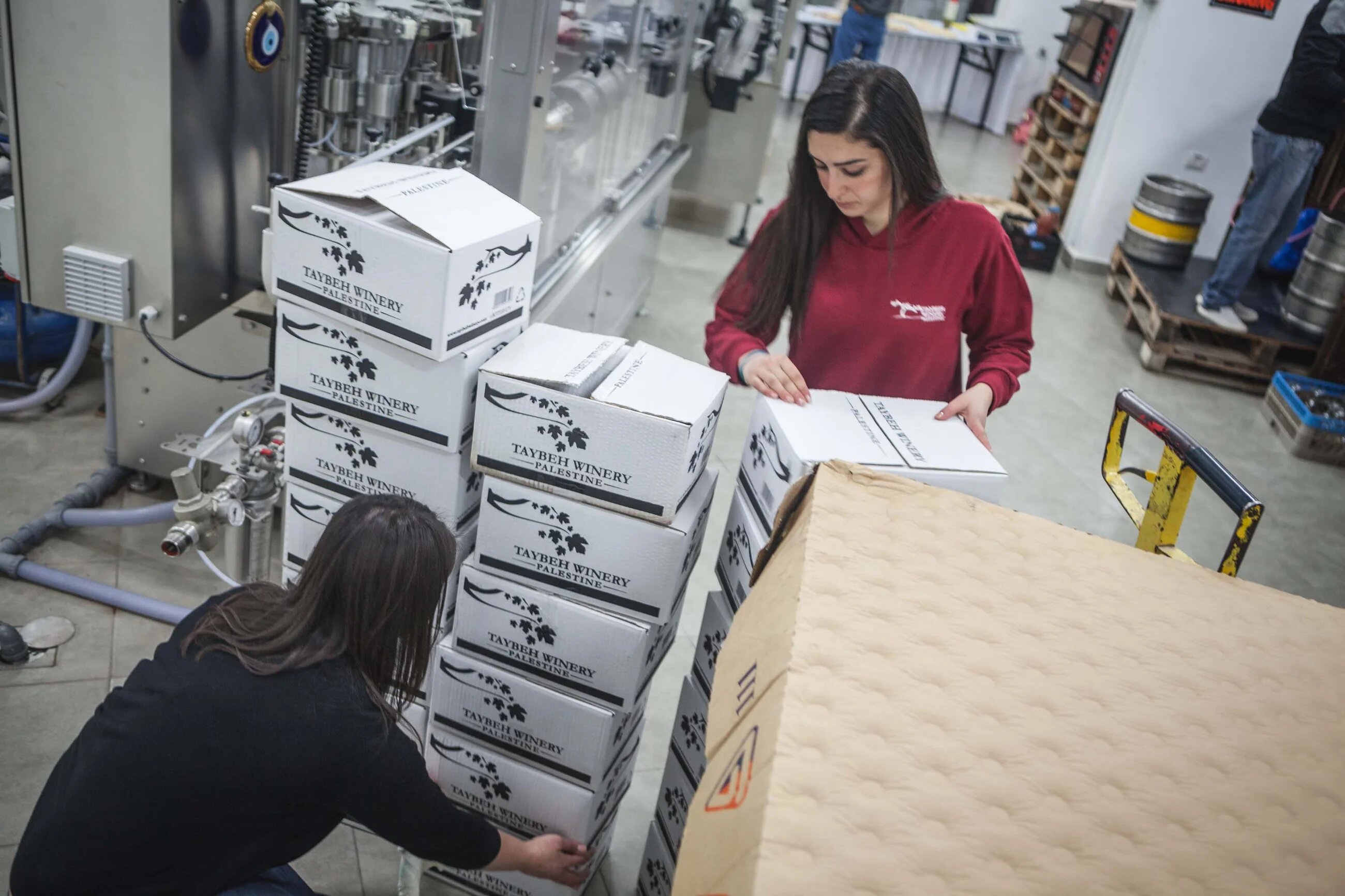 Boxes of the wine read: “Taybeh Winery: Palestine”. Labelling the wine Palestinian will raise the cost of exporting the winery’s products to the international market due to a lack of bilateral trade agreements with Palestine. (MEE/Andre Dicenzo)