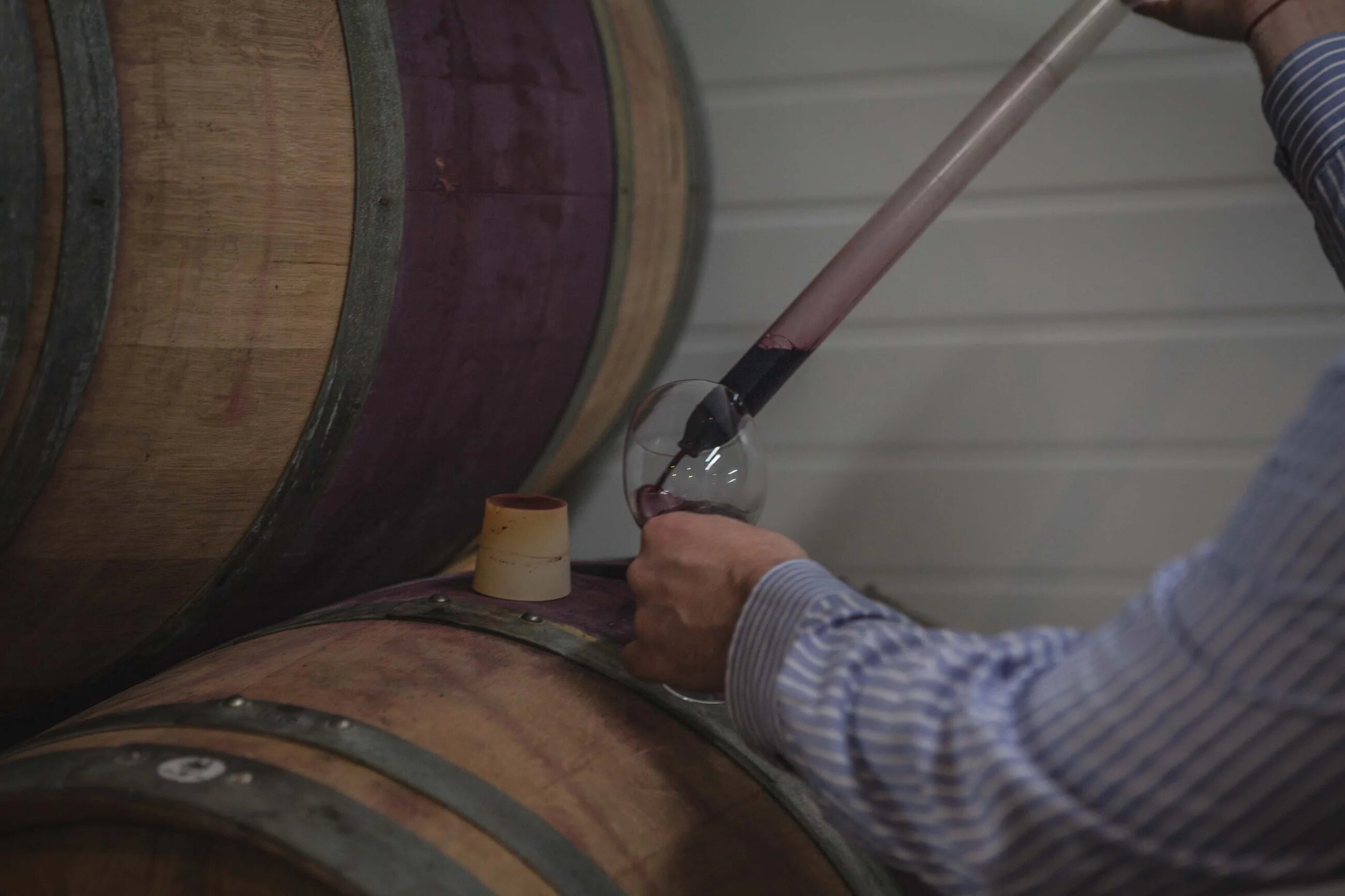 Canaan Khoury, Nadim's son and co-owner of the winery, pulls wine from a plexi wine “thief” - a long thin tube that is able to test the wine from the middle of the barrel. The device is also used to give samples of wine straight from the barrel to guests. (MEE/Andrea Dicenzo)