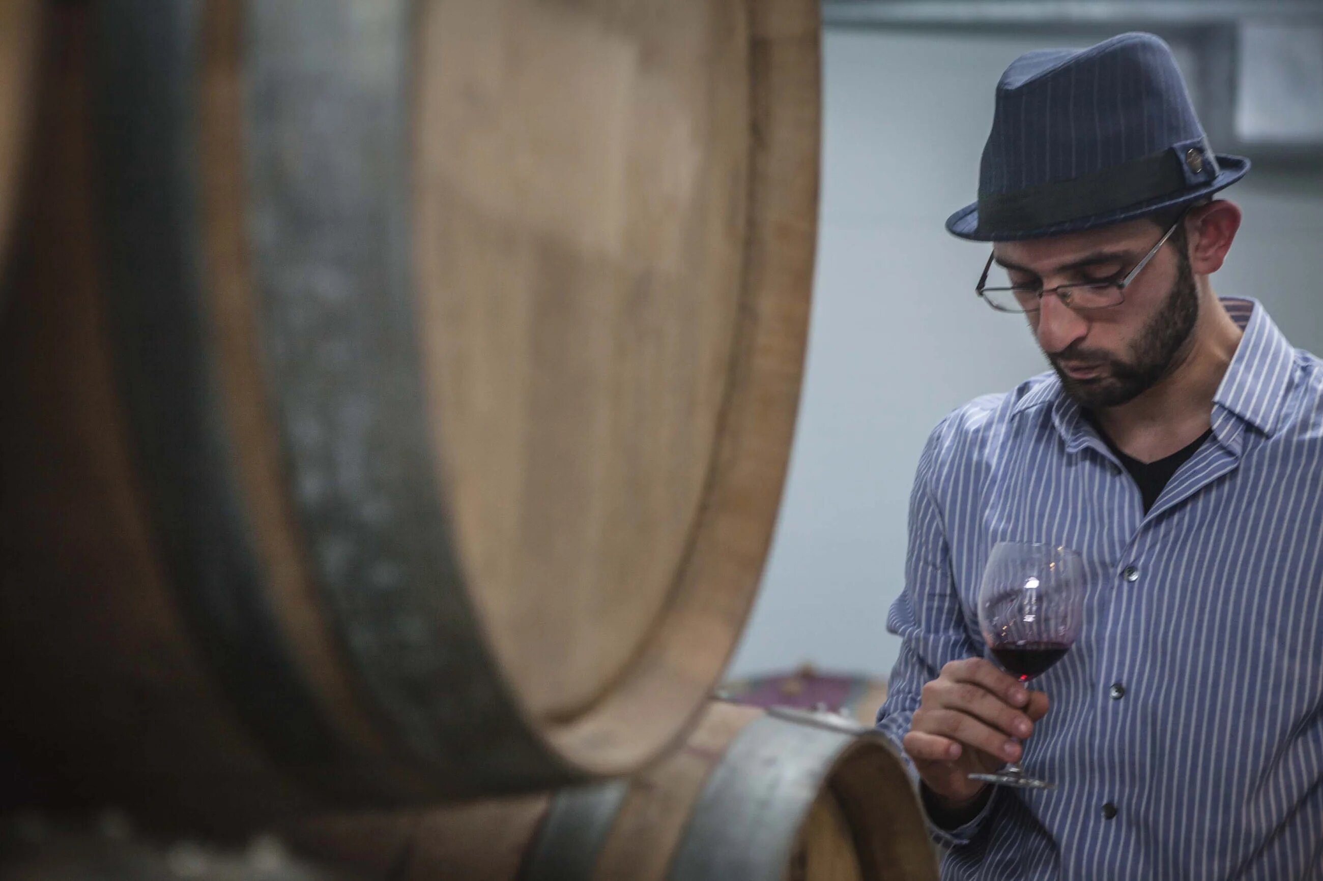 Canaan Khoury inspects the new wine straight from the barrel in the winery’s showroom. (MEE/Andrea Dicenzo)