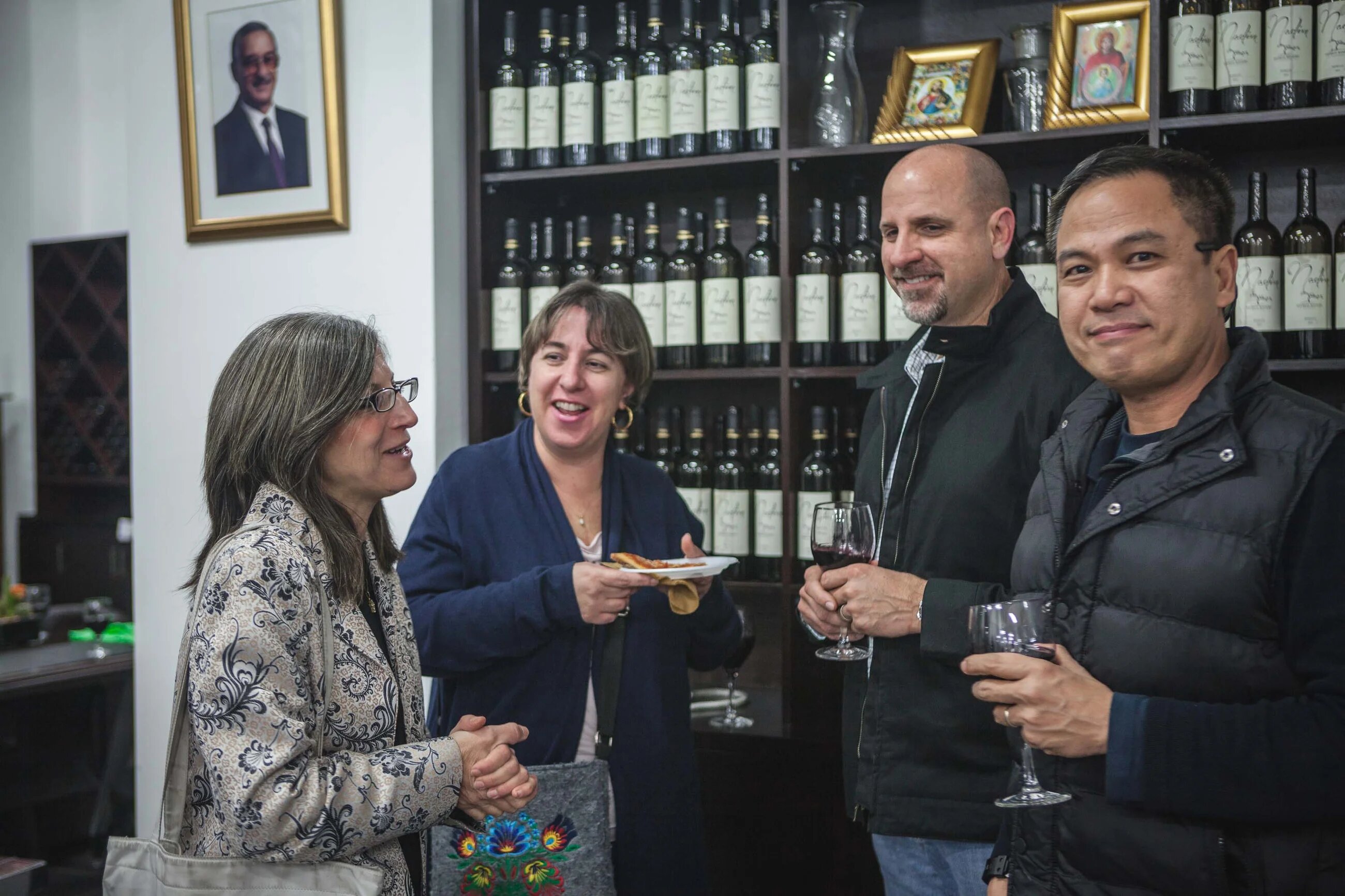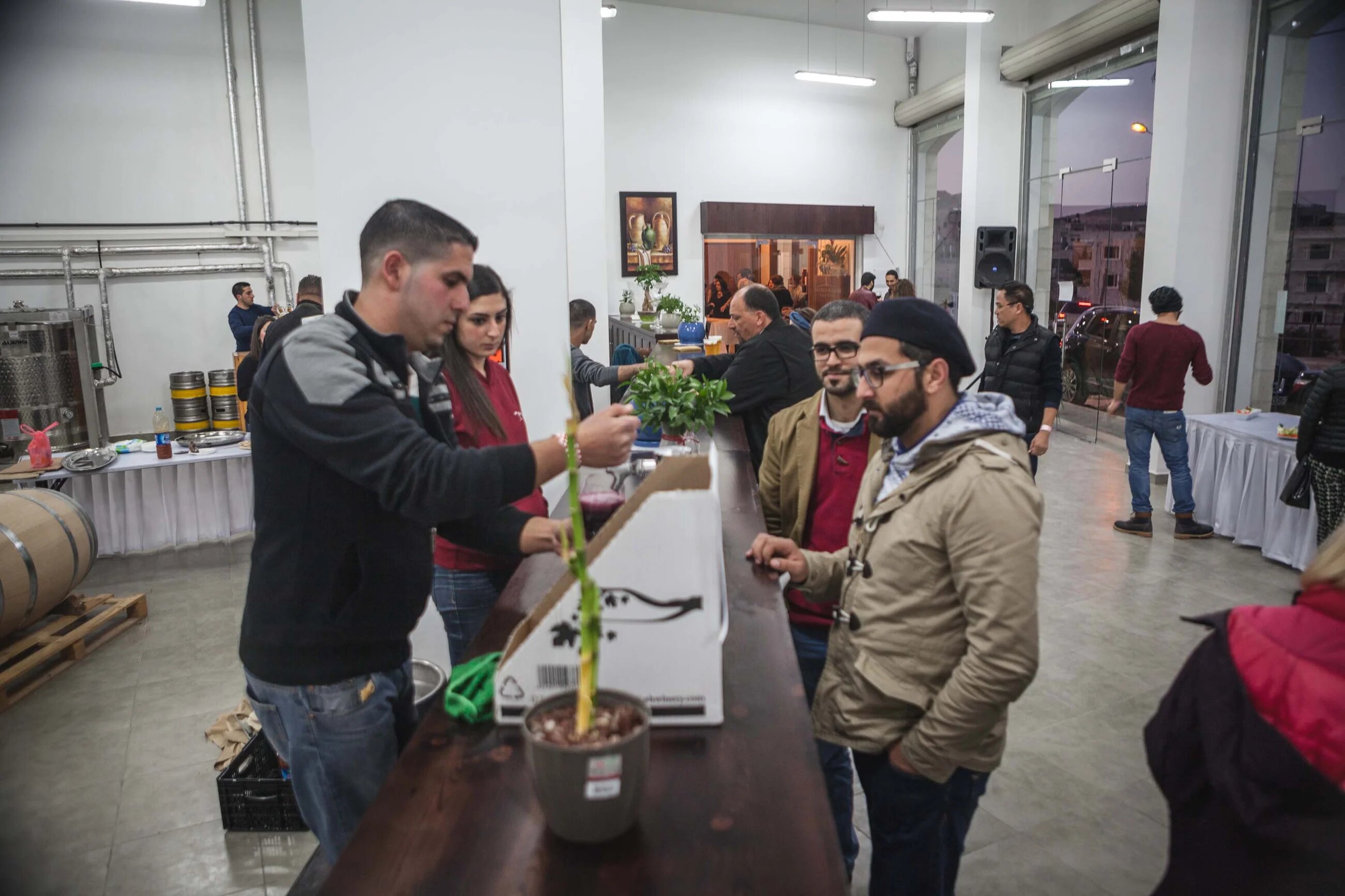 Guests enjoy their wine in the main showroom of the winery, as bottles of Nadim, the name of the wine, which means “drinking buddy” in Arabic, are proudly displayed along the wall. (MEE/Andrea Dicenzo)