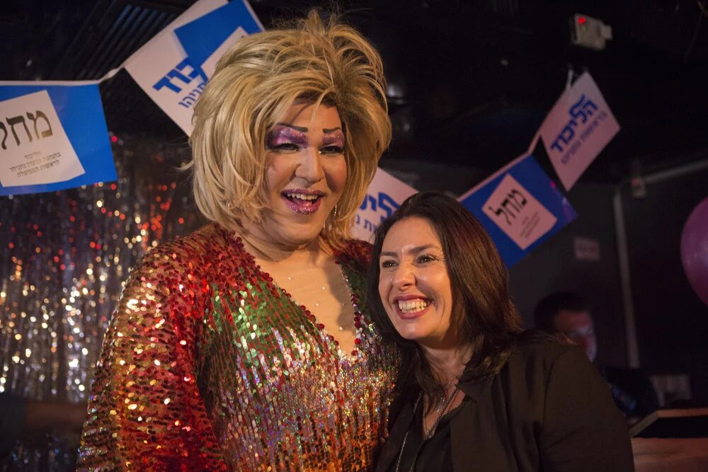 Drag artist Ziona Patriot poses Likud party MP Miri Regev at a gay bar in Tel Aviv. Many parties have been fighting to attract the LGBT vote during the campaign (MEE/Oren Ziv and Yotam Ronen)