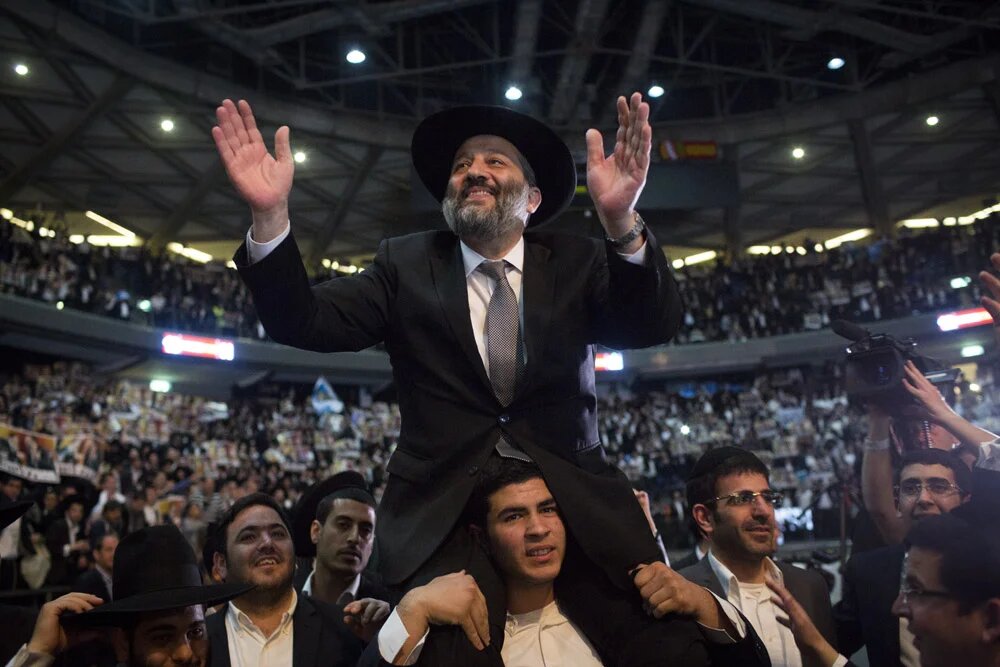 The leader of the Sephardic Orthodox Shas party, Aryeh Deri, is held aloft by a supporter at a conference in Tel Aviv (MEE/Oren Ziv and Yotam Ronen)