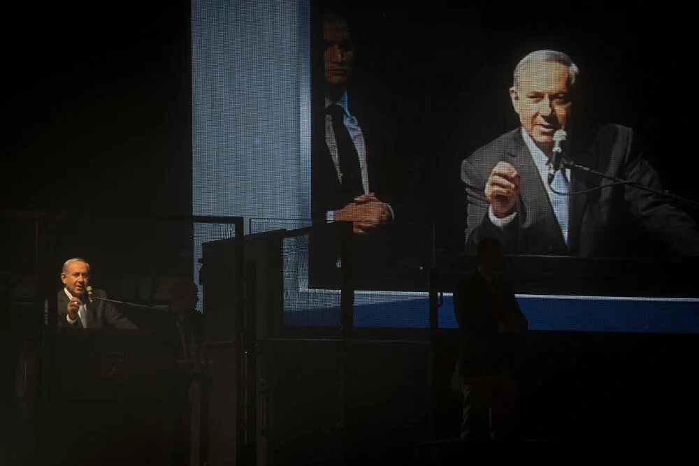 Israeli Prime Minister Benjamin Netanyahu, vying for a third term in office, speaks to supporters during a rally in Tel Aviv two days ahead of the 17 March ballot (MEE/Oren Ziv and Yotam Ronen)