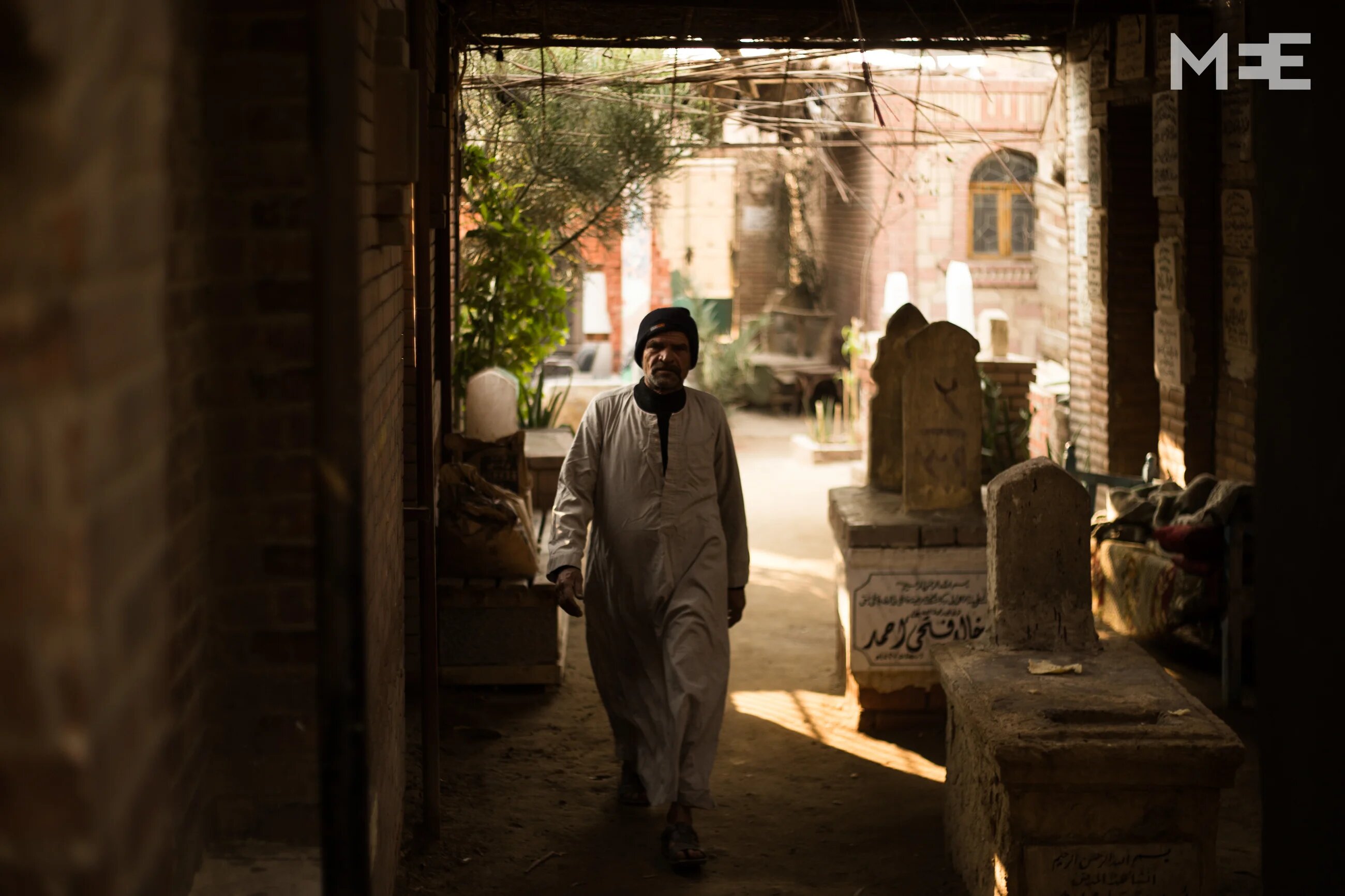 An elderly resident of al-Arafa is seen walking towards the door of the tomb where he lives (MEE/Belal Darder)